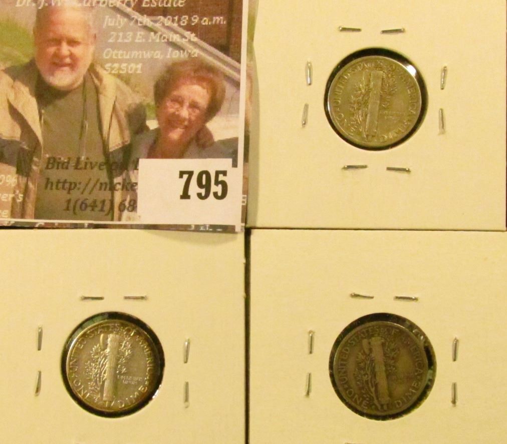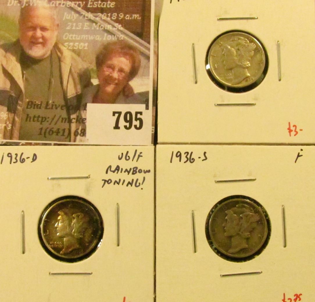 (3) Mercury Dimes, 1936 XF, 1936-D VG/F rainbow toning, 1936-S F, group value $8+
