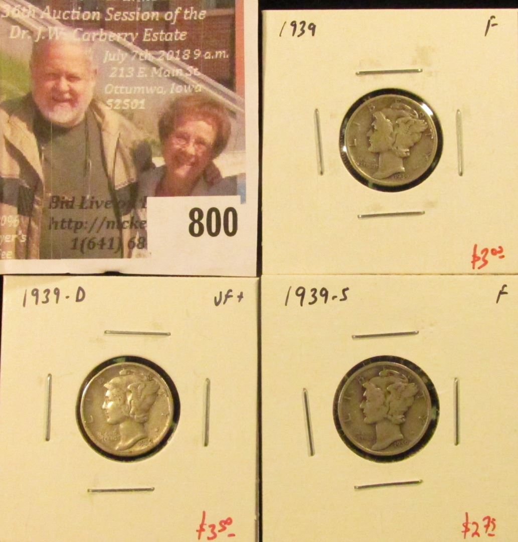 (3) Mercury Dimes, 1939 F, 1939-D VF+, 1939-S F, group value $9+