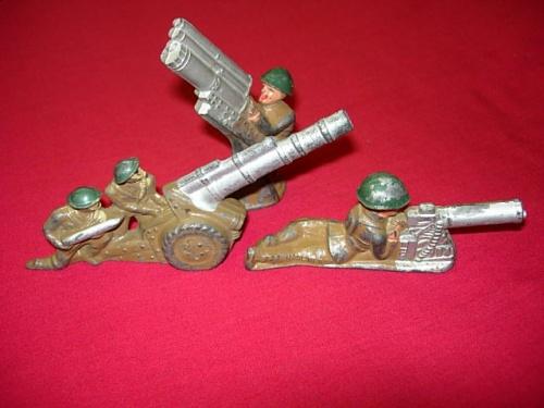 3 Metal US Toy Soldiers includes: 2 soldiers w/launcher and gas masks, soldier w/tommy gun, soldier lying down with gun *noting paint wear