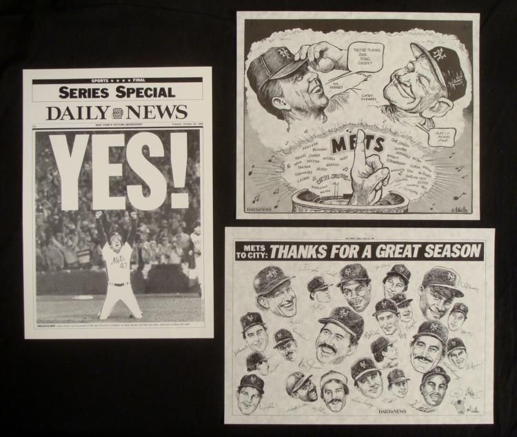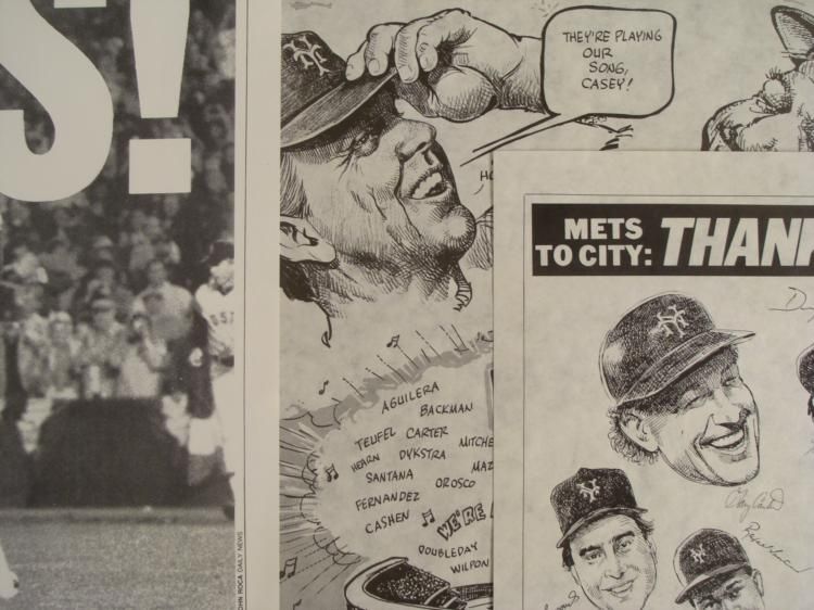 These 3 inserts are originals that came in a special edition of the New York Daily News, dated October 28, 1986. They celebrate the World Series victory of the Mets, with a winning moment photo, and some terrific illustrations. Sizes: 11 1/2" x 13 1/2" 10 1/2" x 15" 11" x 15"Condition: Excellent Three Poster Inserts include: Daily News Jesse Orosco and the winning moment front page print Gil Hodges & Casey Stengel drawing Mets Team: Thanks for a great season, with caricatures of the players