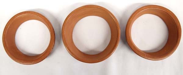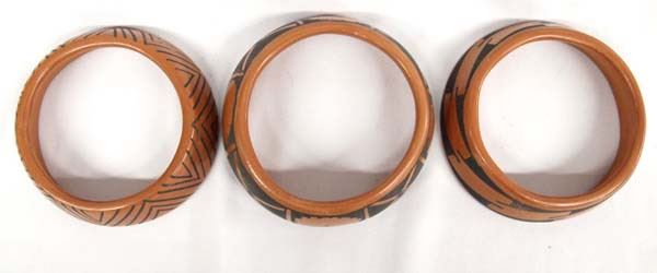 3 Mexican Mata Ortiz Geometric Pottery Rings, measuring 4.25'' bottom diameter and 3'' top diameter