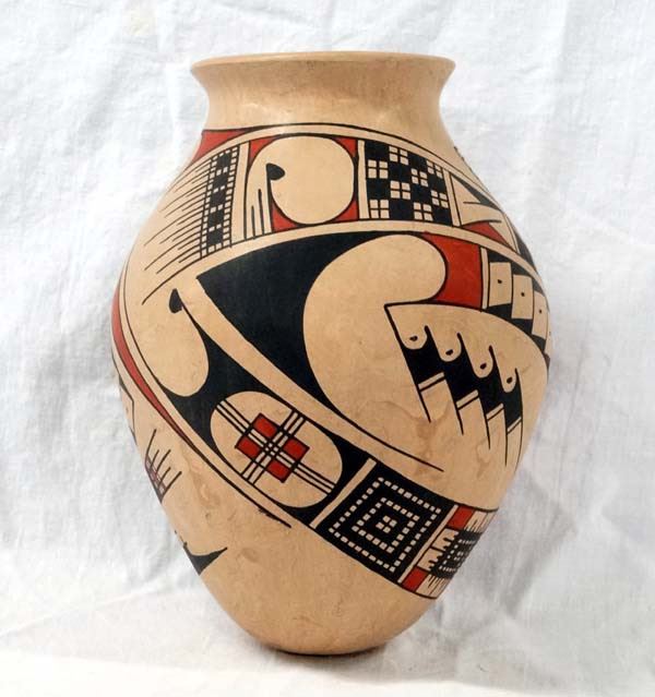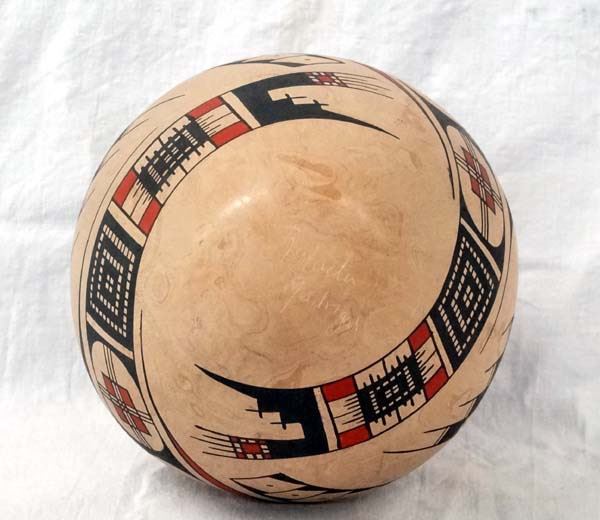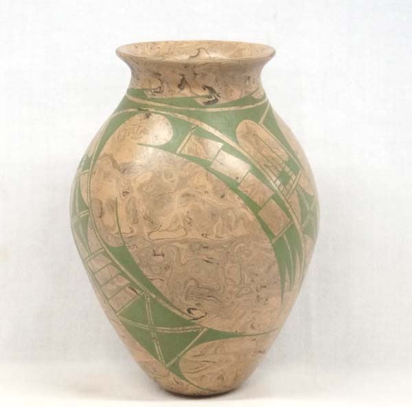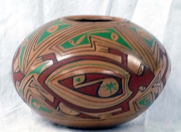 3 Mexican Mata Ortiz Pottery Jars, #1 Mexican Mata Ortiz Marbleized Clay Jar by Fito Tena, measures 5.25''D x 7.5''H, #2 Mexican Mata Ortiz Polychrome Jar by Rafaela Madrigal, measures 7''H x 5''D, signed by artist, features Paquime' inspired lines and designs, flared rim, #3 Mexican Mata Ortiz Polychrome Seed Jar by Rosa Gaona, signed by artist and measures 4''H x 6''D, features maze designs