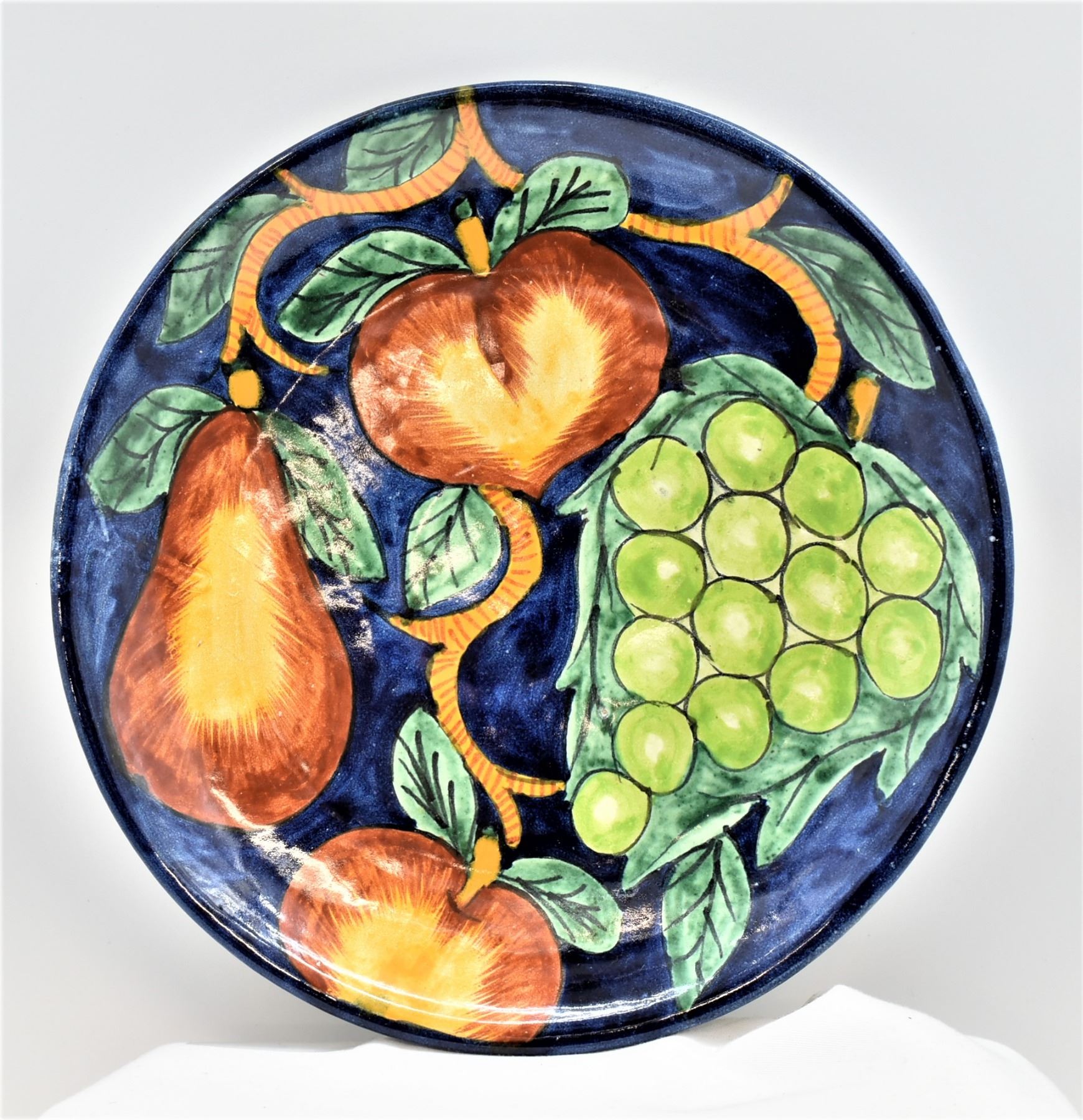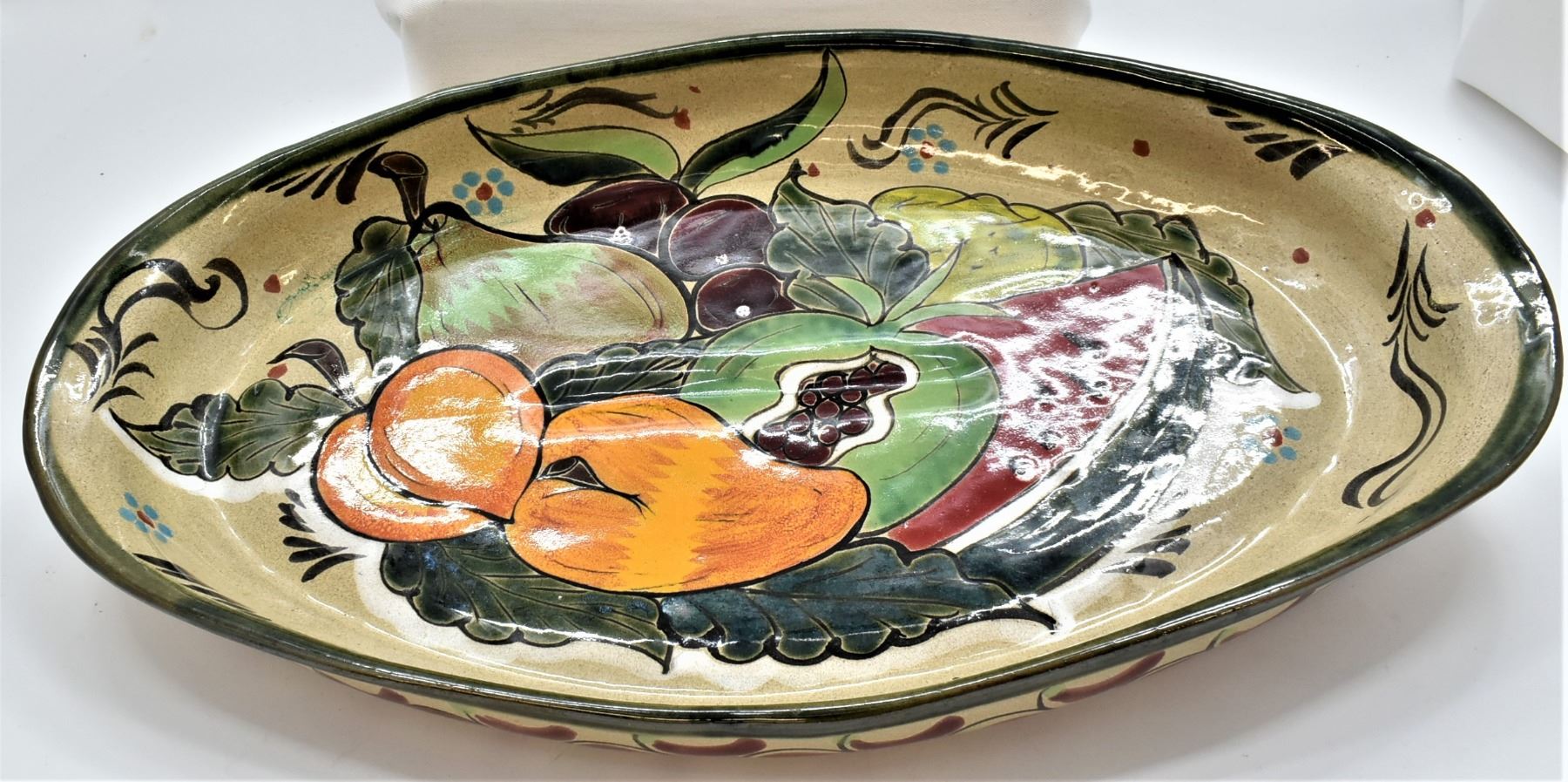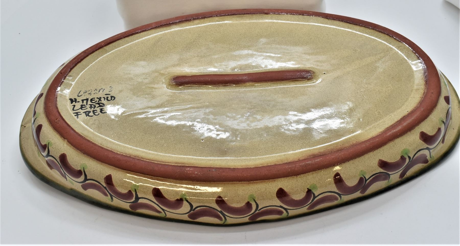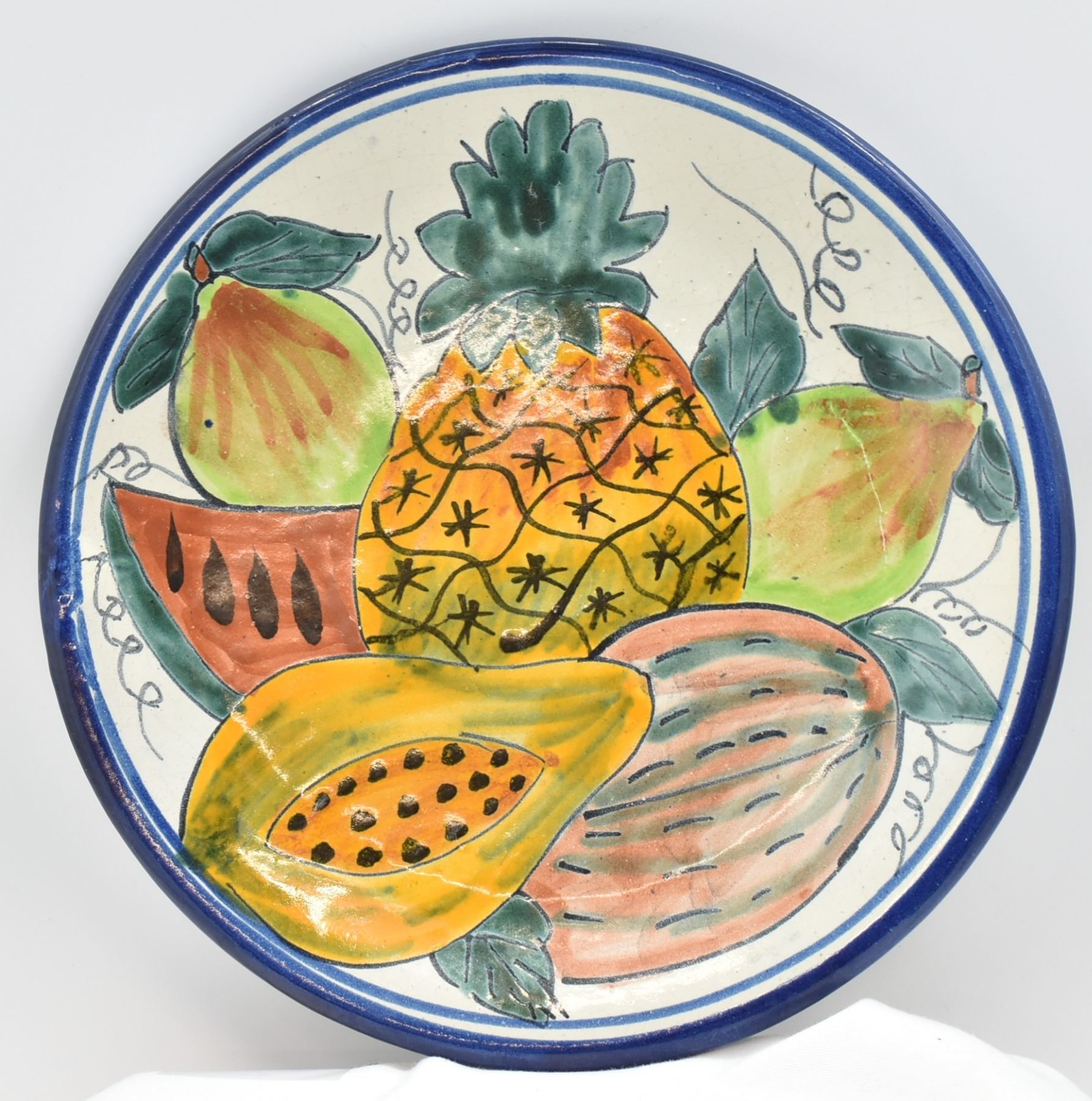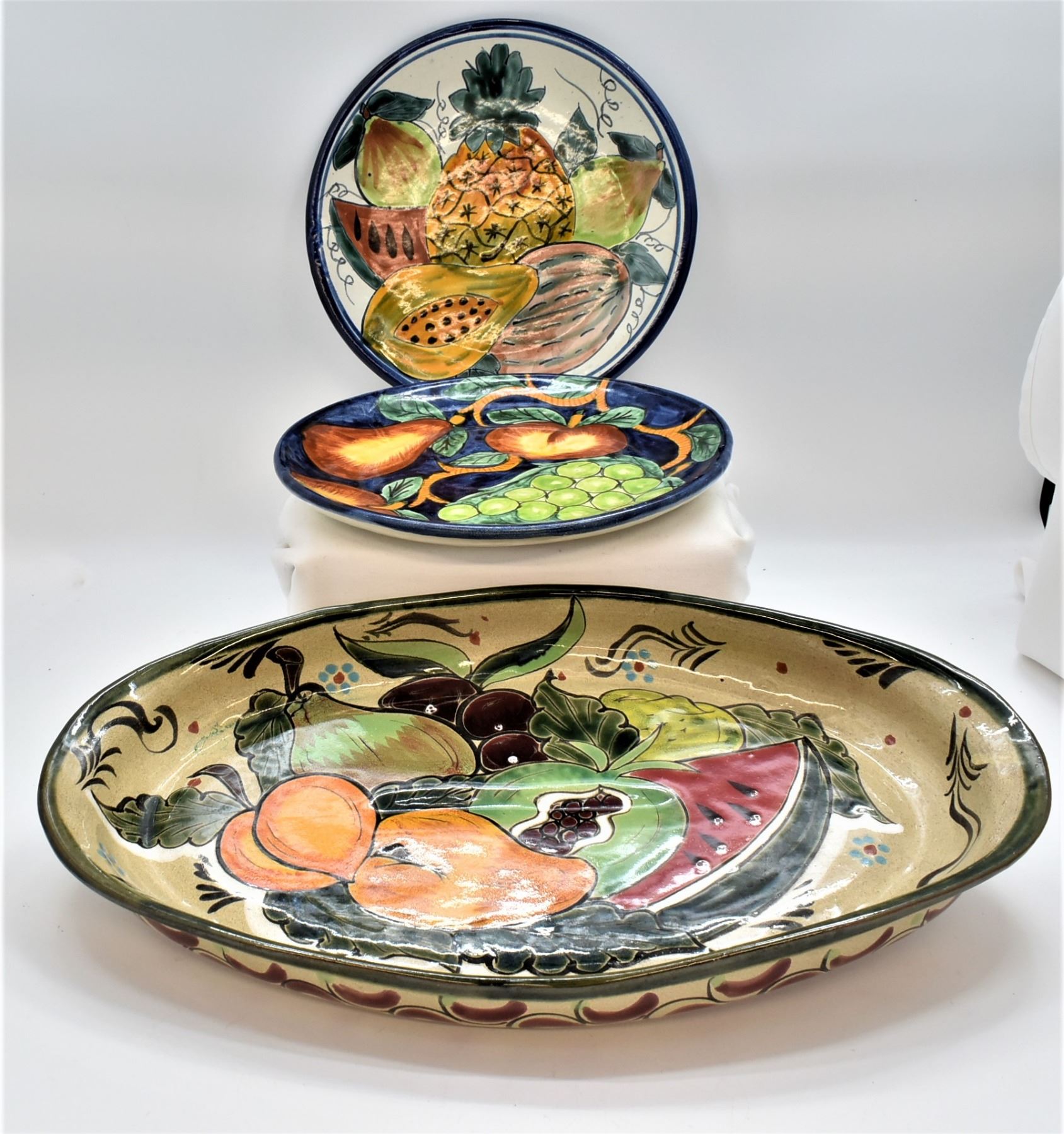 3 Mexican Pottery Collectiles, includes 1. Talavera Plate, measures 10.25''D x 1.25''H, marked on back 2. Vintage Talavera Plate, measures 10.25''D x 7/8''H 3. Lead Free Serving Tray, measures 17.5''L x 9.75''W x 2''H and is marked on the bottom