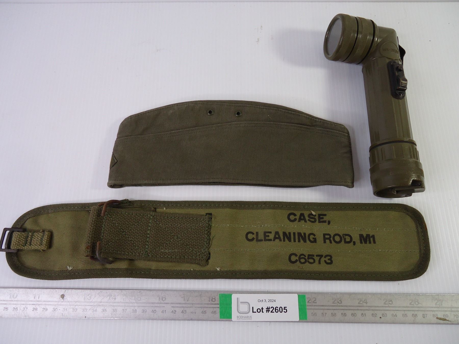 (3) Military Pieces, Flashlight, Cleaning Rod case and Hat
