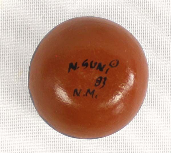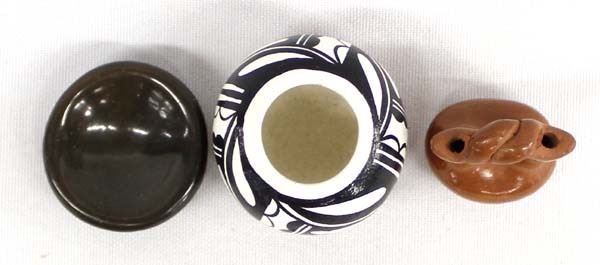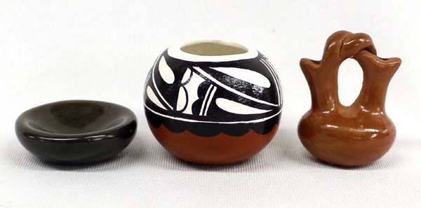 3 Miniature Native American Pots, includes 1. 1983 Polychrome Jar by N. Suni, measures 1.5'' x 1 1/8'' and is signed on the bottom 2. Jemez Pottery Wedding Vase by Dorothy Gachupin, measures 1.5'' x 1'' and is signed on the bottom 3. Santa Clara Bowl, unsigned and measures 1.25''D