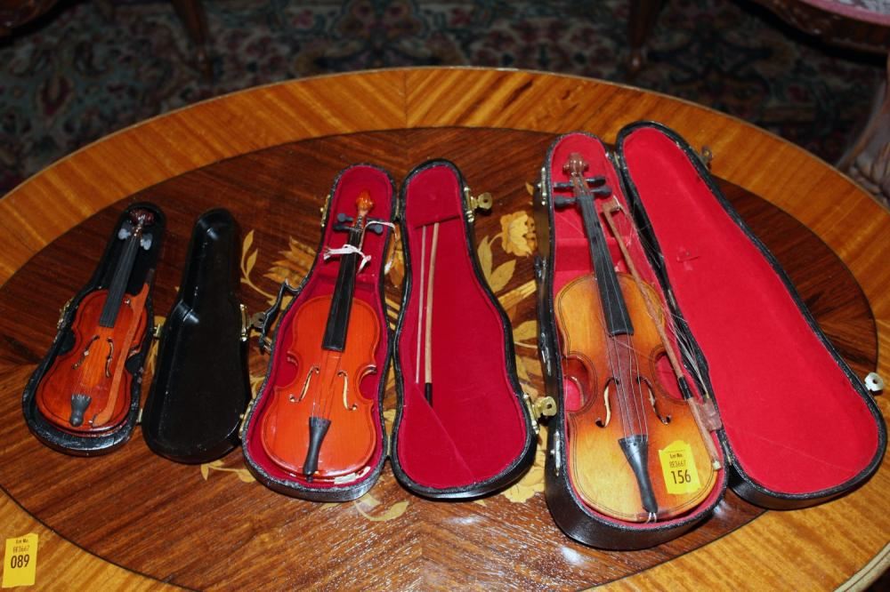 3 Miniature / model violins with cases. Largest measures approx. 10 inches long
