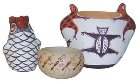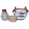 Ca. 1980s - 1990s, Collection of three miniature pottery pieces including a bowl with frog figures signed EK, a smaller bowl with ant designs by C. Naha Nampeyo, and an owl figure signed QK. Largest 2-7/8" x 2-1/2"