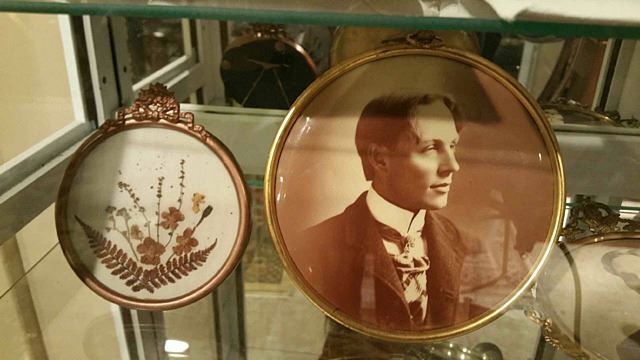 3 Round vintage miniature frames, 2 have portraits, 1 is dried flowers.