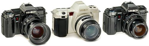 3 Minolta SLR AF Cameras Minolta, Japan. 1) "Minolta Dynax 8000 I" - white. Professional user-camera with AF and motor-drive. White edition. With box. - 2) "Minolta 7000 Kit". With Zoom 4/35-70 mm, second battery box and strap. - 3) "Minolta 7000". With Zoom 4/35-70 mm and box. - And: Minolta AF Zoom 3,5-4,5/35-105, white edition, with box.<Br>