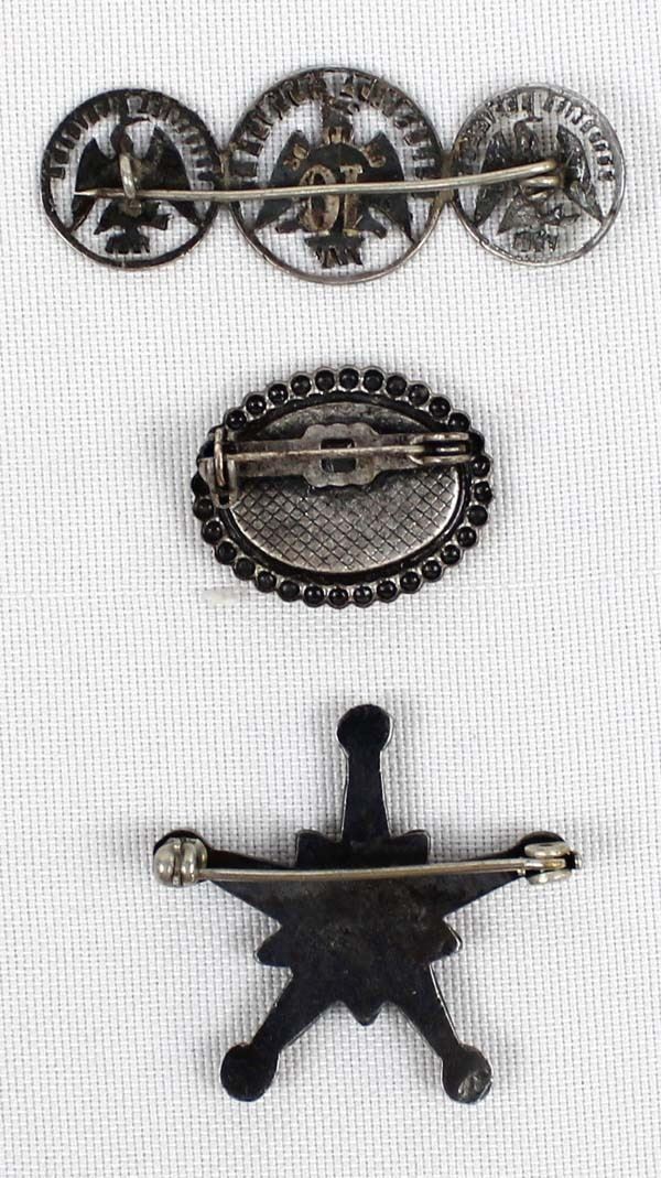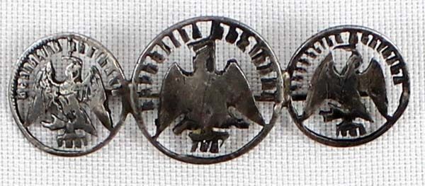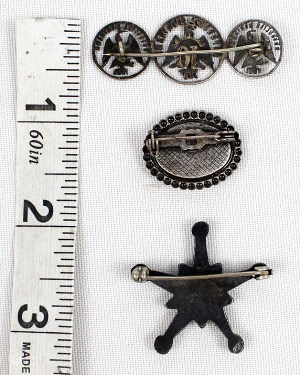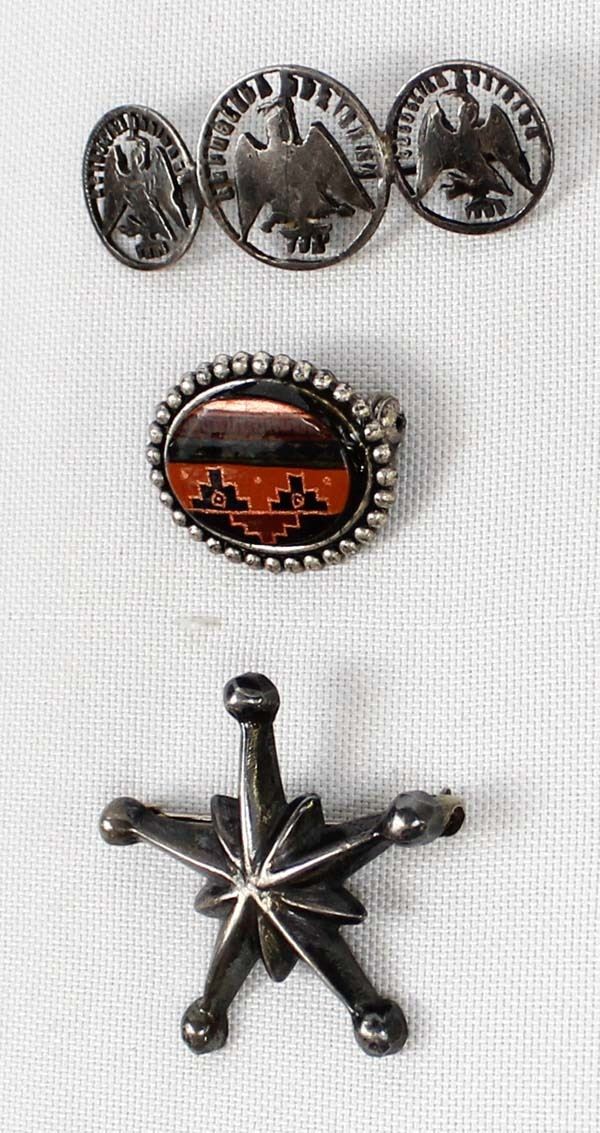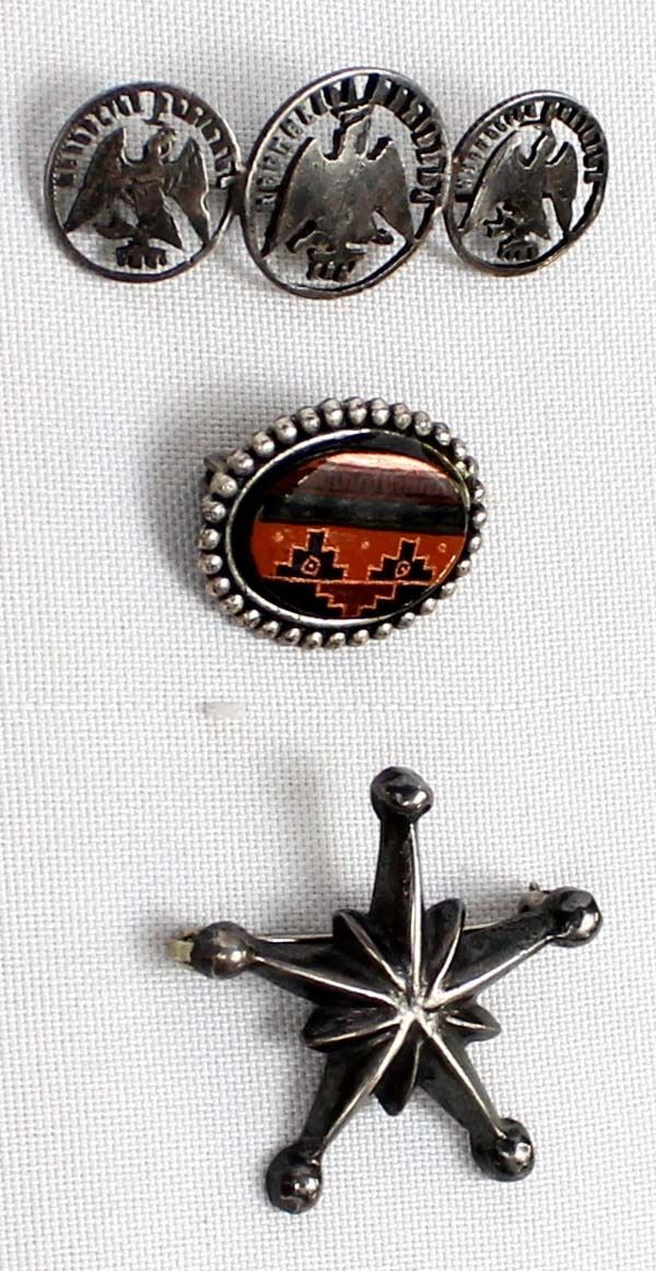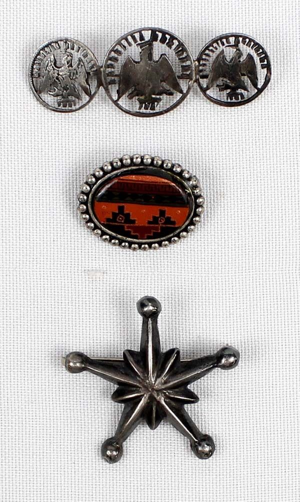 3 Miscellaneous Pins, includes South American Oval Pin, Mexican Centavos Pin (longest measuring 2'' x 5/8''), Star Pin (appears to be sand cast, perhaps Navajo, possibly silver)