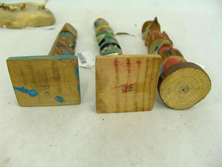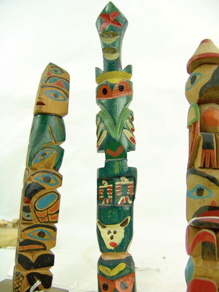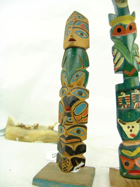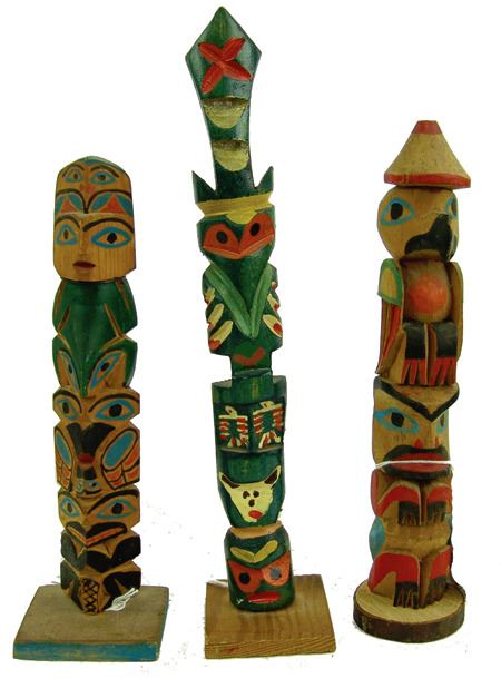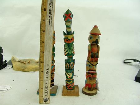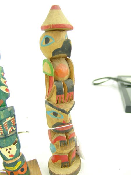 Ca. 1940s-1950s, Collection of three hand carved and painted cedar "tourist" totem poles done in traditional style. Very good condition. Tallest 10-1/2"