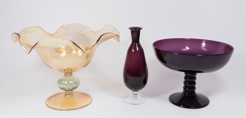One gold-colored footed bowl, approx. 10" H x 12 1/2" W; one purple footed bowl, approx. 8" H x 10 1/2" W; and one purple footed vase, approx. 10" H.