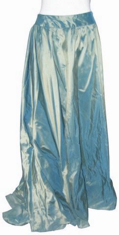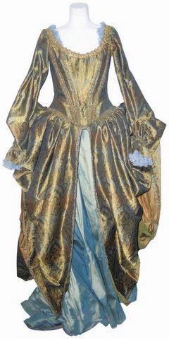 Screen used, hero dress worn by Constance (Gabriella Wilde) in Paul W.S. Anderson's 2011 adventure 'The Three Musketeers.' 'Wardrobe is comprised of a metallic gold fabric, low neckline long dress with teal highlights, and a metallic fabric, teal green slip/underdress.