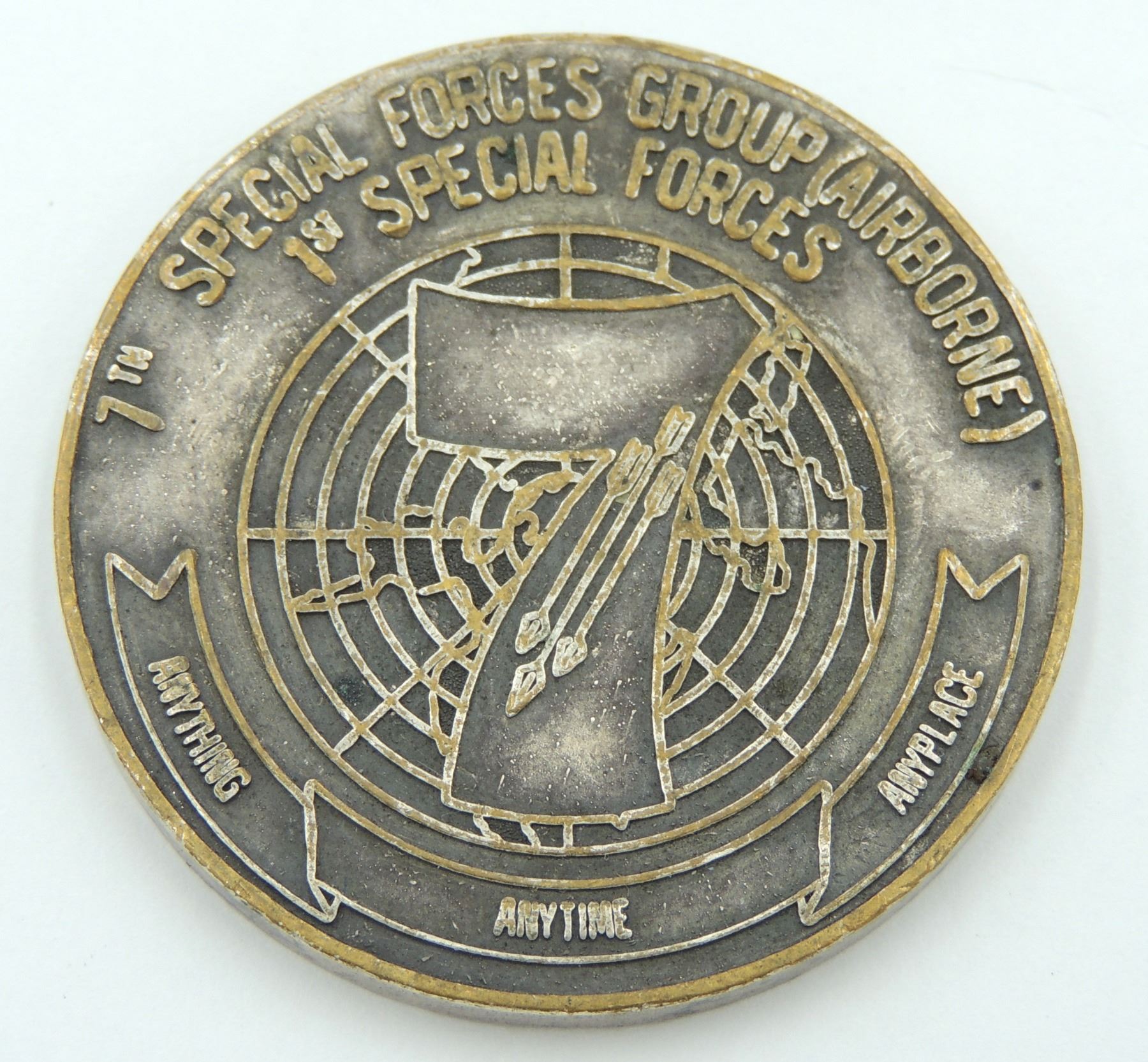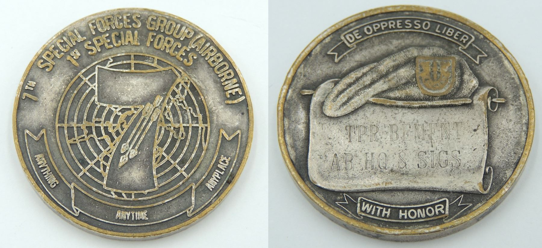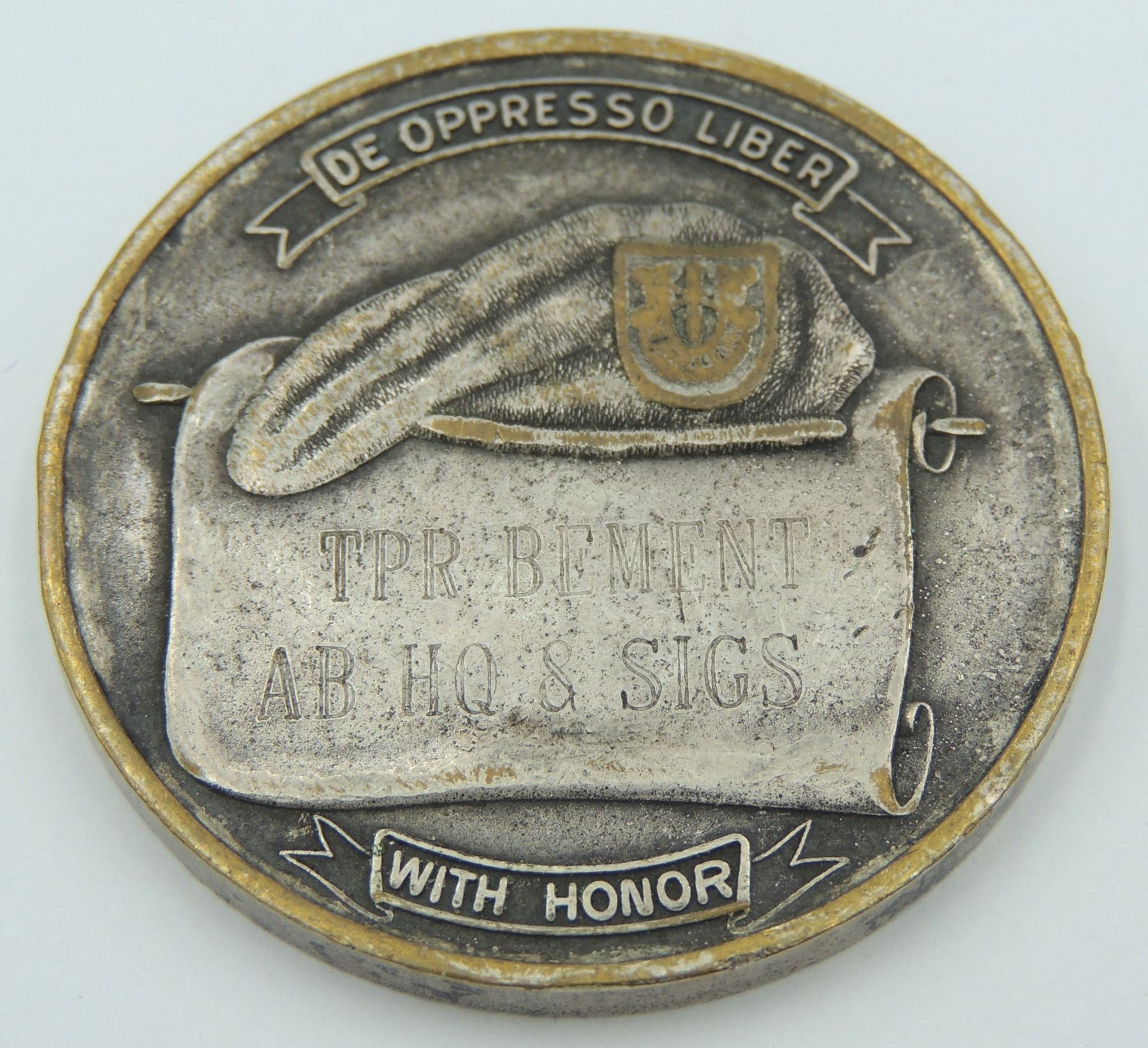 NAMED TO "TPR BEMENT AB HQ S SIGS" - 7TH SPECIAL FORCES GROUP (AIRBORNE) 1ST SPECIAL FORCES "ANYTHING ANYTIME ANYPLACE" , REVERSE READS IN LATIN "DE OPPRESSO LIBER" AND "WITH HONOR" OR "TO LIBERATE THE OPPRESSED" UNITED STATES OF AMERICA MILITARY SPECIAL FORCES