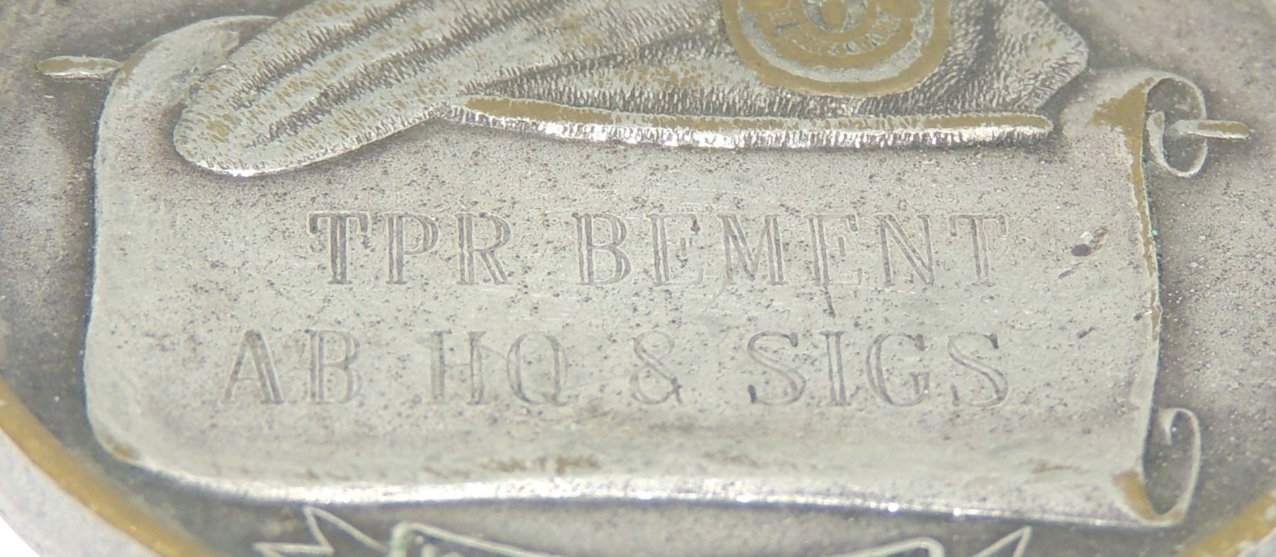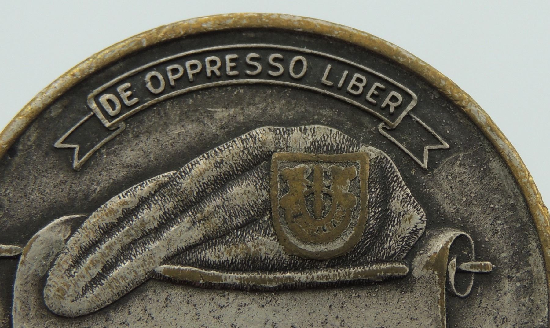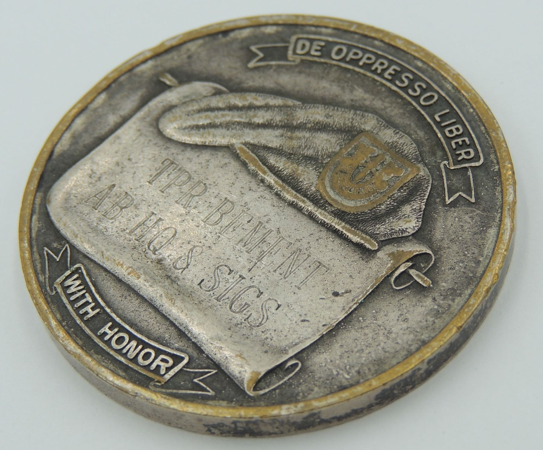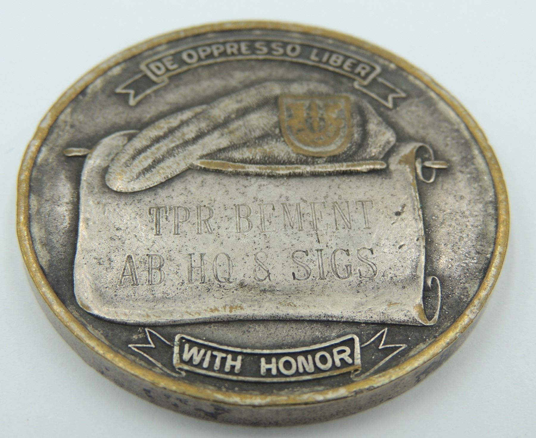 NAMED TO "TPR BEMENT AB HQ S SIGS" - 7TH SPECIAL FORCES GROUP (AIRBORNE) 1ST SPECIAL FORCES "ANYTHING ANYTIME ANYPLACE" , REVERSE READS IN LATIN "DE OPPRESSO LIBER" AND "WITH HONOR" OR "TO LIBERATE THE OPPRESSED" UNITED STATES OF AMERICA MILITARY SPECIAL FORCES