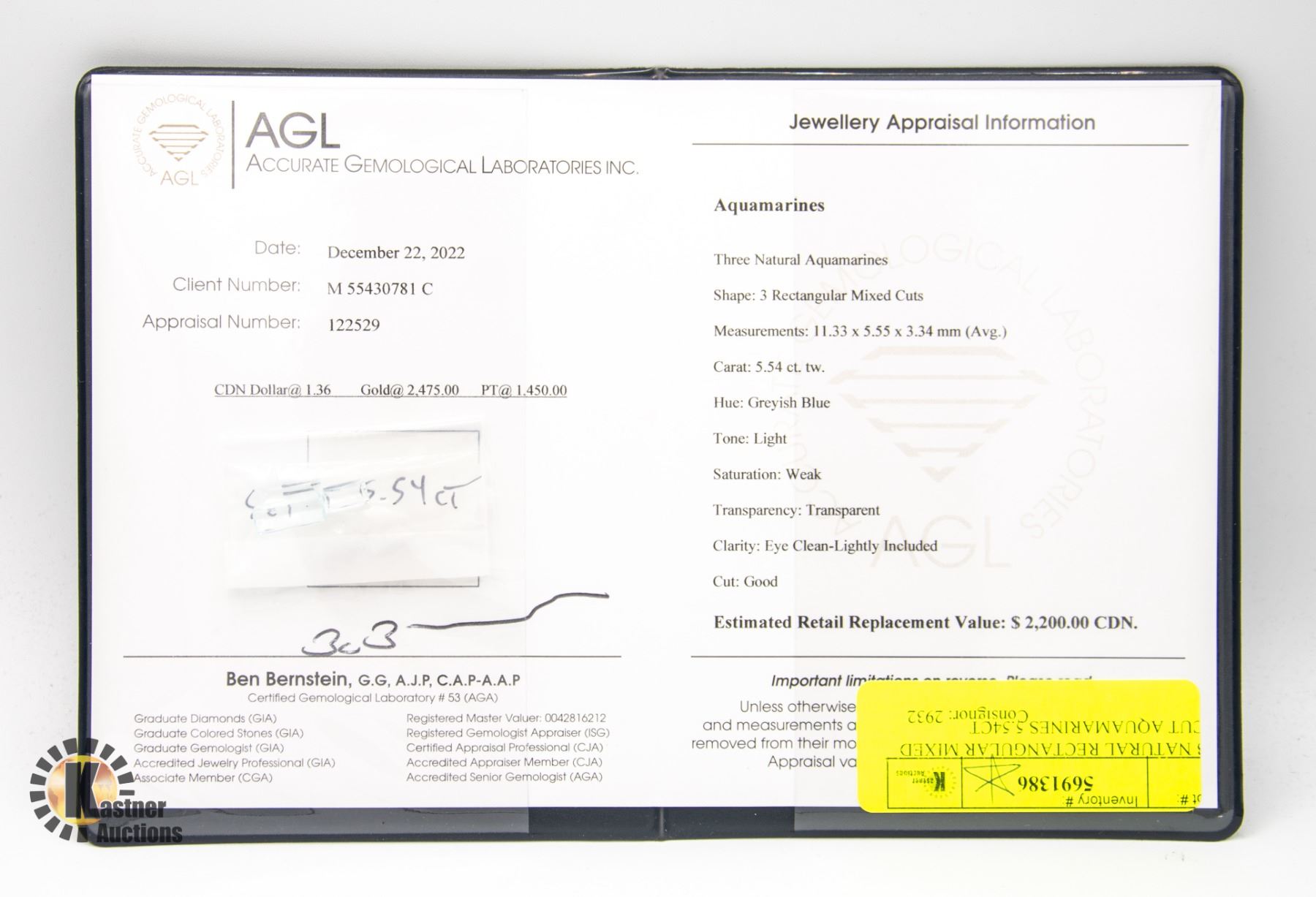 (COMBINED CARAT WEIGHT OF 5.54CT) MEASURING 11.33 X 5.55 X 3.34 MM, HUE IS GREYISH BLUE, TONE IS LIGHT, SATURATION IS WEAK, TRANSPARENT GEMSTONE WITH EYE CLEAN TO LIGHTLY INCLUDED CLARITY, CUT IS GOOD. COMES WITH APPRAISAL FROM AGL (APPRAISAL NUMBER 122529) APPRAISED VALUE $2,200.00 **ALL ITEMS MUST BE REMOVED BY 5PM SATURDAY, SEPTEMBER 2ND 2023. ALL REMAINING ITEMS WILL BE SUBJECT TO A $6.00 PER DAY STORAGE CHARGE. ANY ITEMS REMAINING AFTER MONDAY, SEPTEMBER 18TH, 2023 WILL BE CONSIDERED FORFEITED. NO REFUNDS WILL BE ISSUED FOR FORFEITED ITEMS. TO SCHEDULE A PICK UP APPOINTMENT CLICK HERE