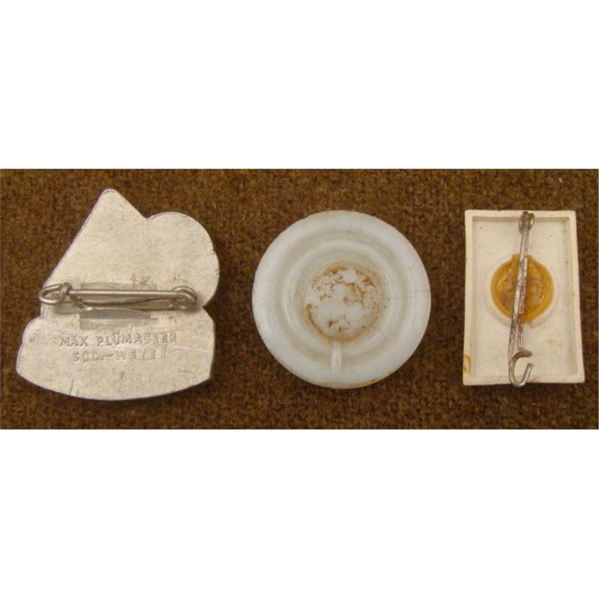 OFFERED HERE ARE THREE NAZI MEDALS. ONE IS A FACTORY WORKER PIN MARKED "MAX PLUMAGHER-SUD WEYER". ANOTHER IS A RED CROSS DONATION PIN. THE LAST ONE IS OF A EAGLE AND SWASTIKA ON A PEARL WHITE TOKEN. *