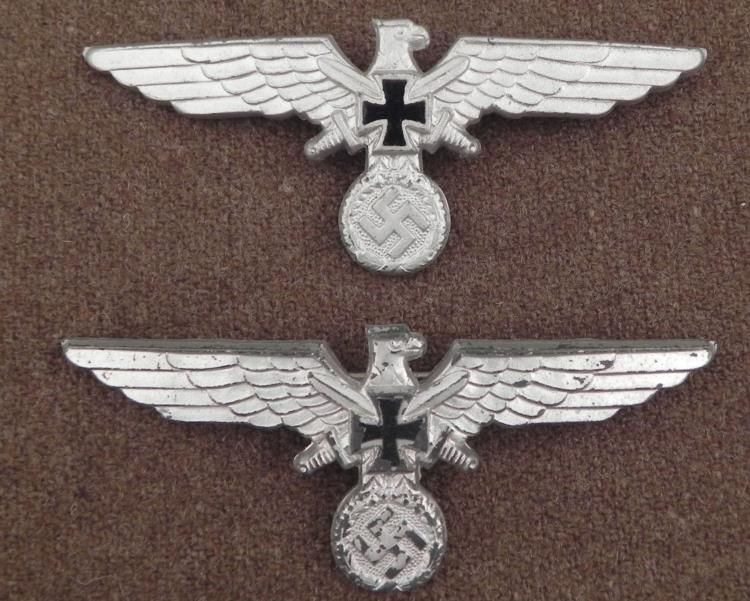 3 NAZI UNIFORM BREAST INSIGNIA-ORIG-METAL-4"WIDE MARKED-EAGLE & SWASTIKA & IRON CROSS * * 2 NICE GUARANTEED ORIG LARGE 4" UNIFORM BREAST INSIGNIA TAKEN FROM FACTORY-NEVER ISSUED-VET PICKUP-CONVEX-HEAVY METAL WITH LONG PIN REVERSE--MARKED "GES GESCH" *