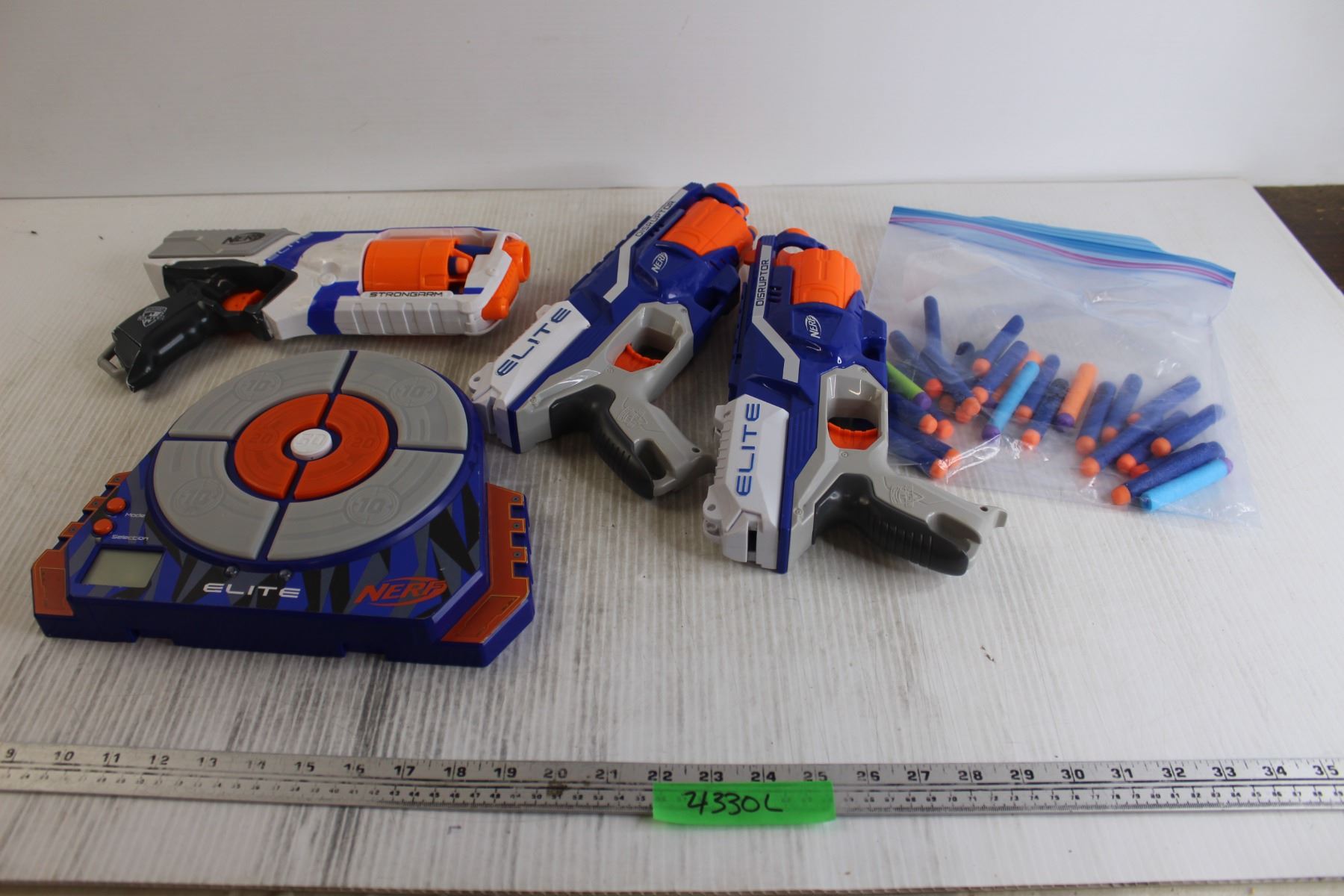 (3) NERF Elite Toy Guns, Target Board, (15+) NERF Bullets