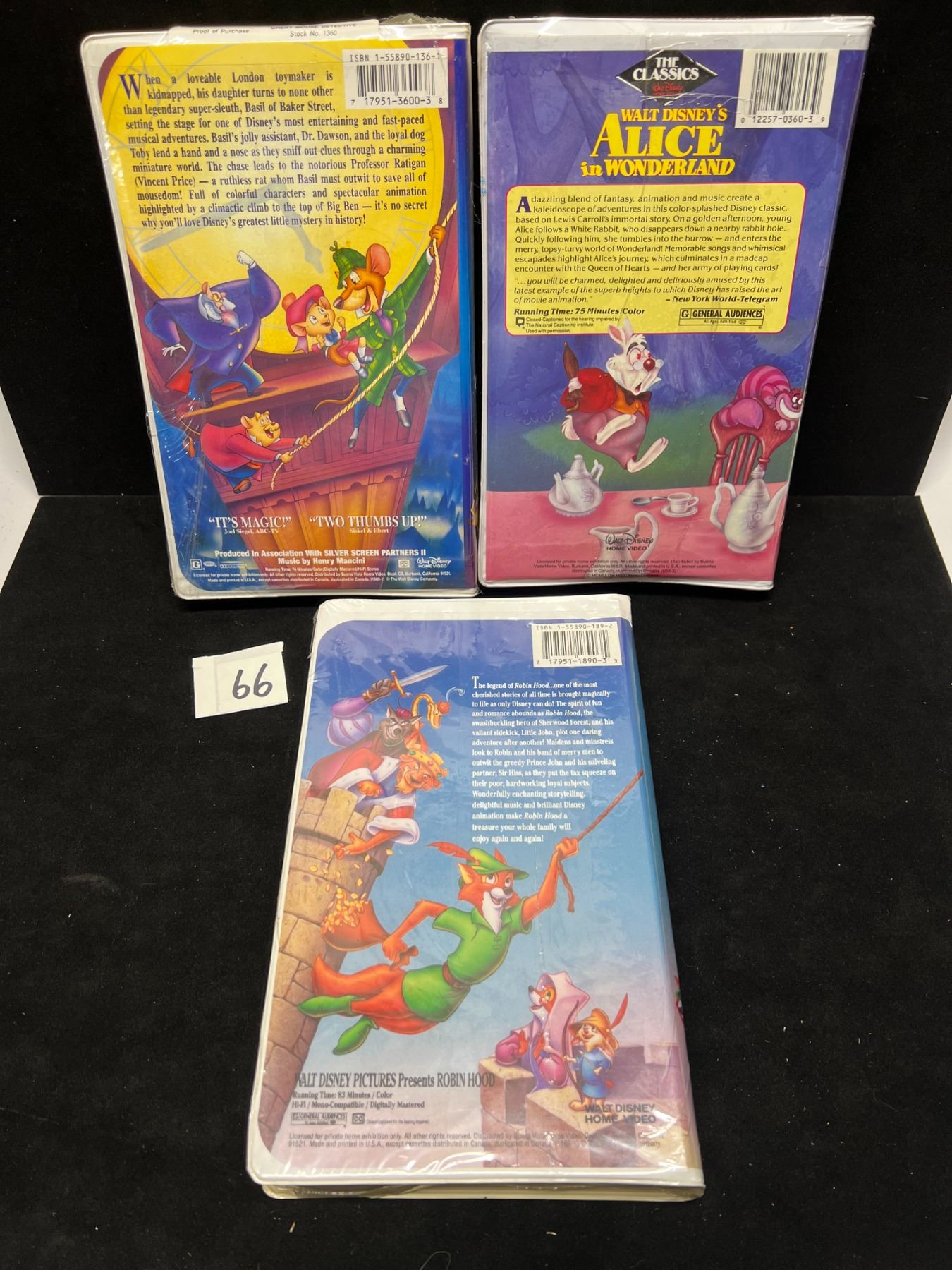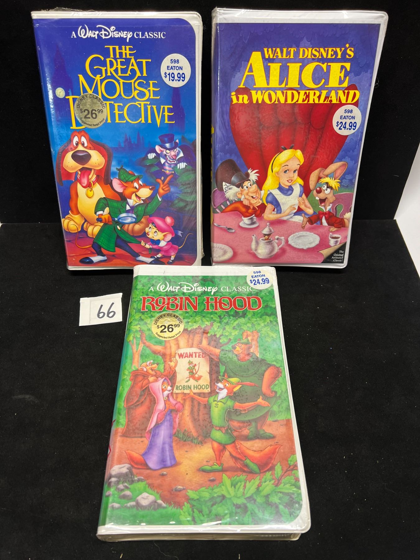 3 NEW SEALED Disney VHS Movies Robin Hood Alice in Wonderland Mouse Detec