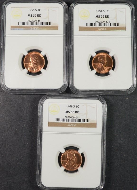 3 - NGC MS 66 RD LINCOLN WHEAT CENTS - 1949-S, 1954-S, 1955-S