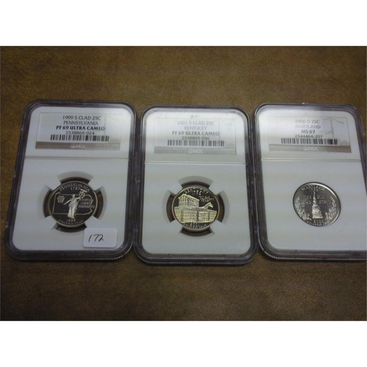 1999-S PENNSYLVANIA QUARTER PF69 ULTRA CAMEO, 2001-S KENTUCKY QUARTER PF69 ULTRA CAMEO AND 2000-D MARYLAND QUARTER MS67