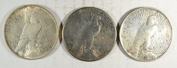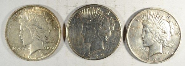 LOT INCLUDES 1922, 1923-S, AND 1924 PEACE DOLLARS, A GREAT WAY TO BUY SILVER, ESTIMATE $105.00 TO $115.00