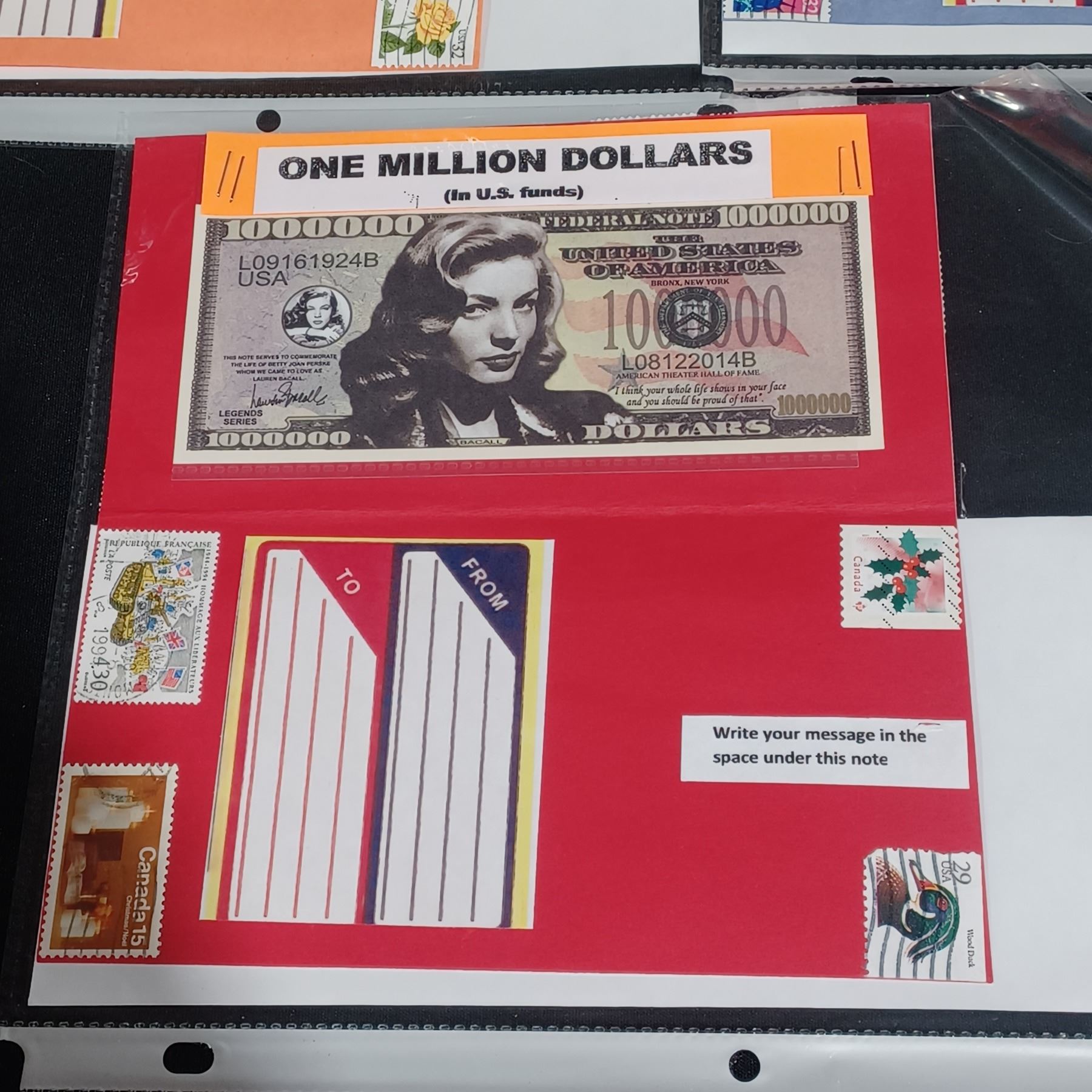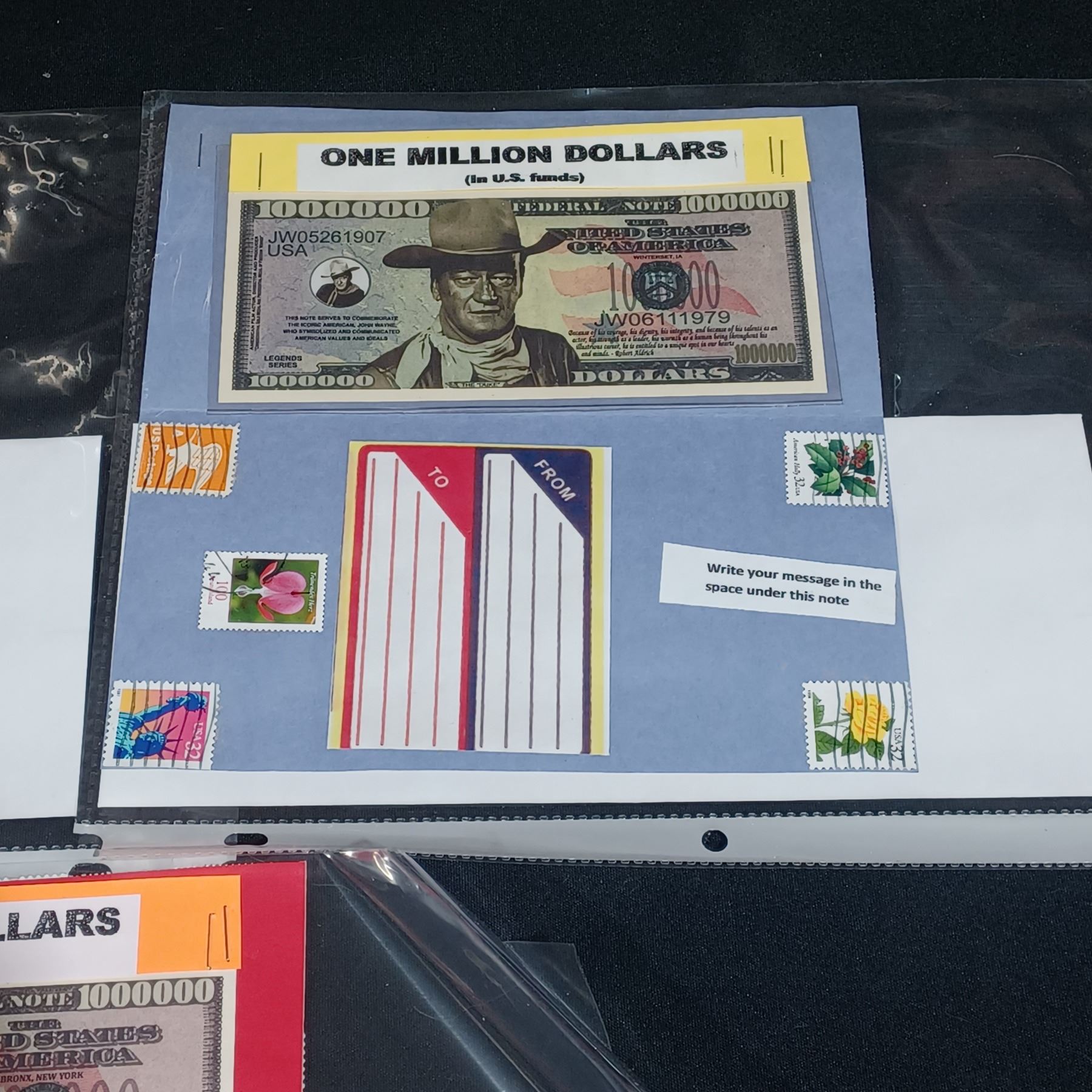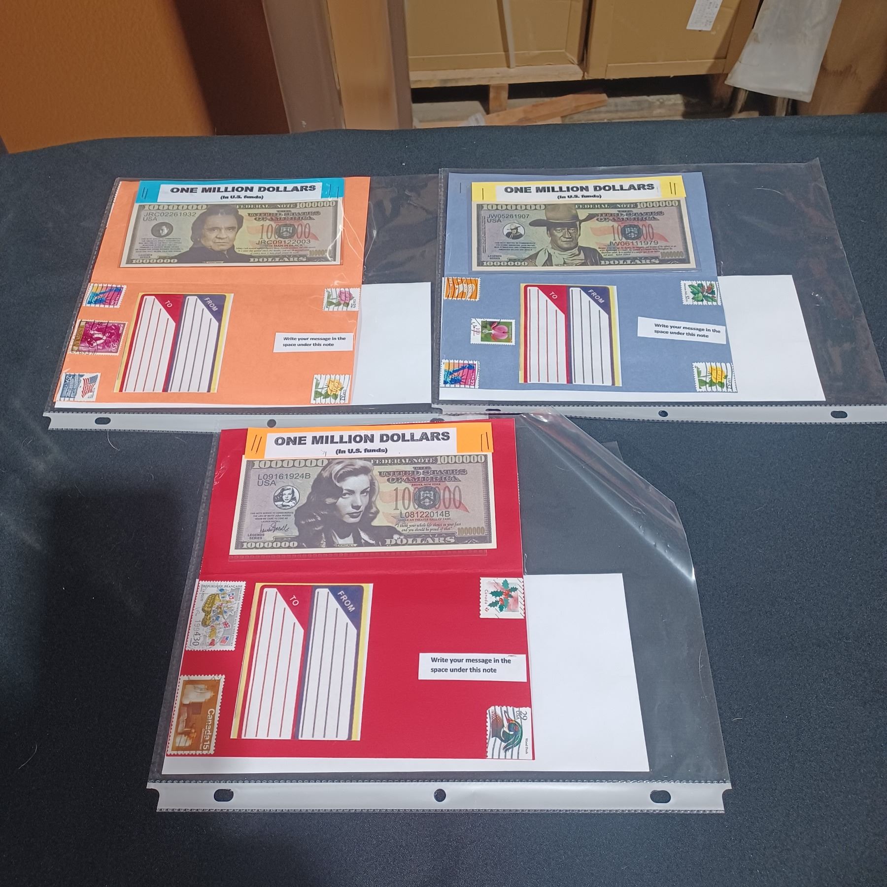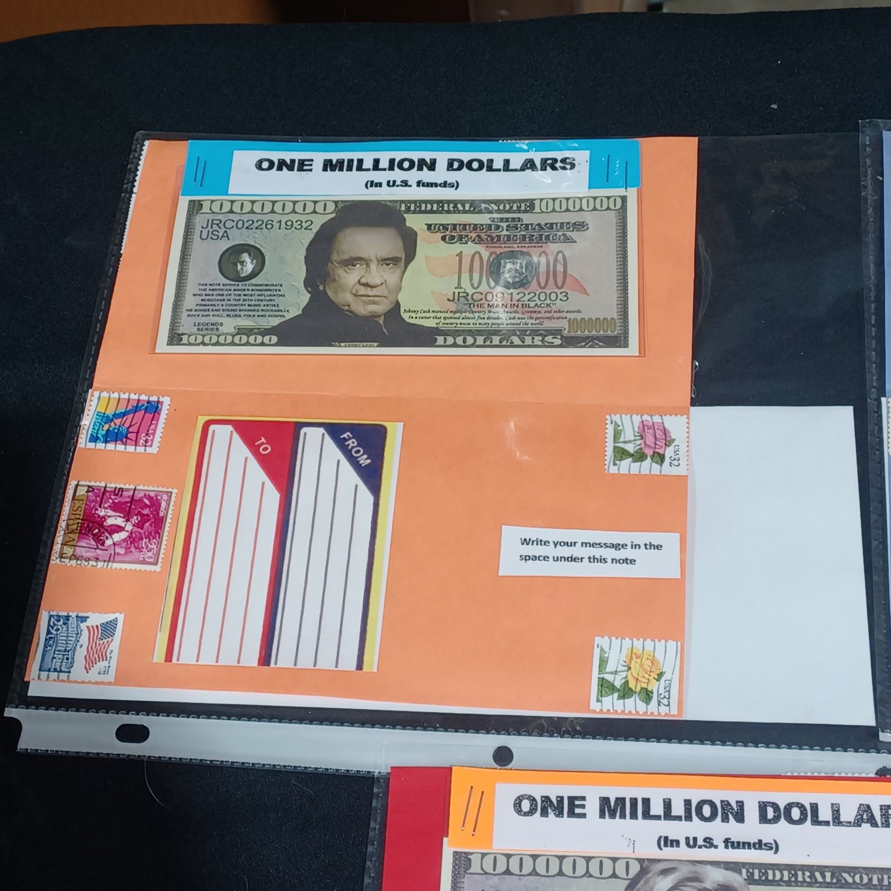 3 NOVELTY BILLS AND ASSORTED STAMPS