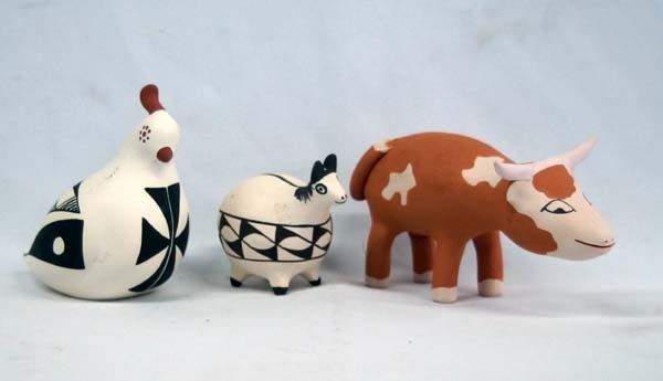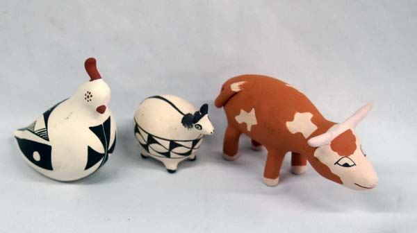 3 Native American Acoma Pottery Animals, includes 1 horned cow, 1 horse signed Joyce L., and one quail M. Chino, sweet collection, largest measures 6''L x 3''H x 3''W, cow's horn has been glued