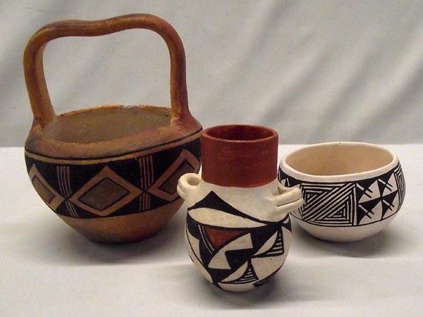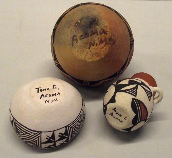 3 Native American Acoma Pottery. The largest pottery measures approx. 5''H x 4''W. One is signed Joyce L. another signed Tena G. Buyers Pay Actual Shipping and Handling Charges(see terms and conditions for more information).