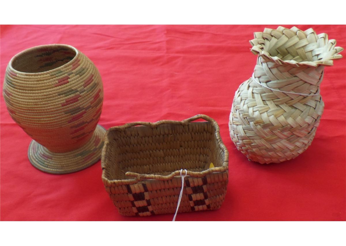 3 Native American Baskets from the 1940s. Made of plant fiber. Eskimo basket is 6" from Canada, Tarahumara basket is 6" from Mexico and the smallest Salish basket is 5" from Canada. Nice collection of baskets from various areas. Great lot for any collector. Condition: All have minor wear, see images. Shipping: $22.