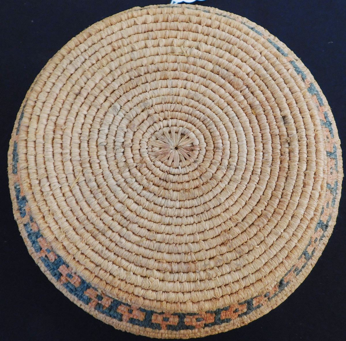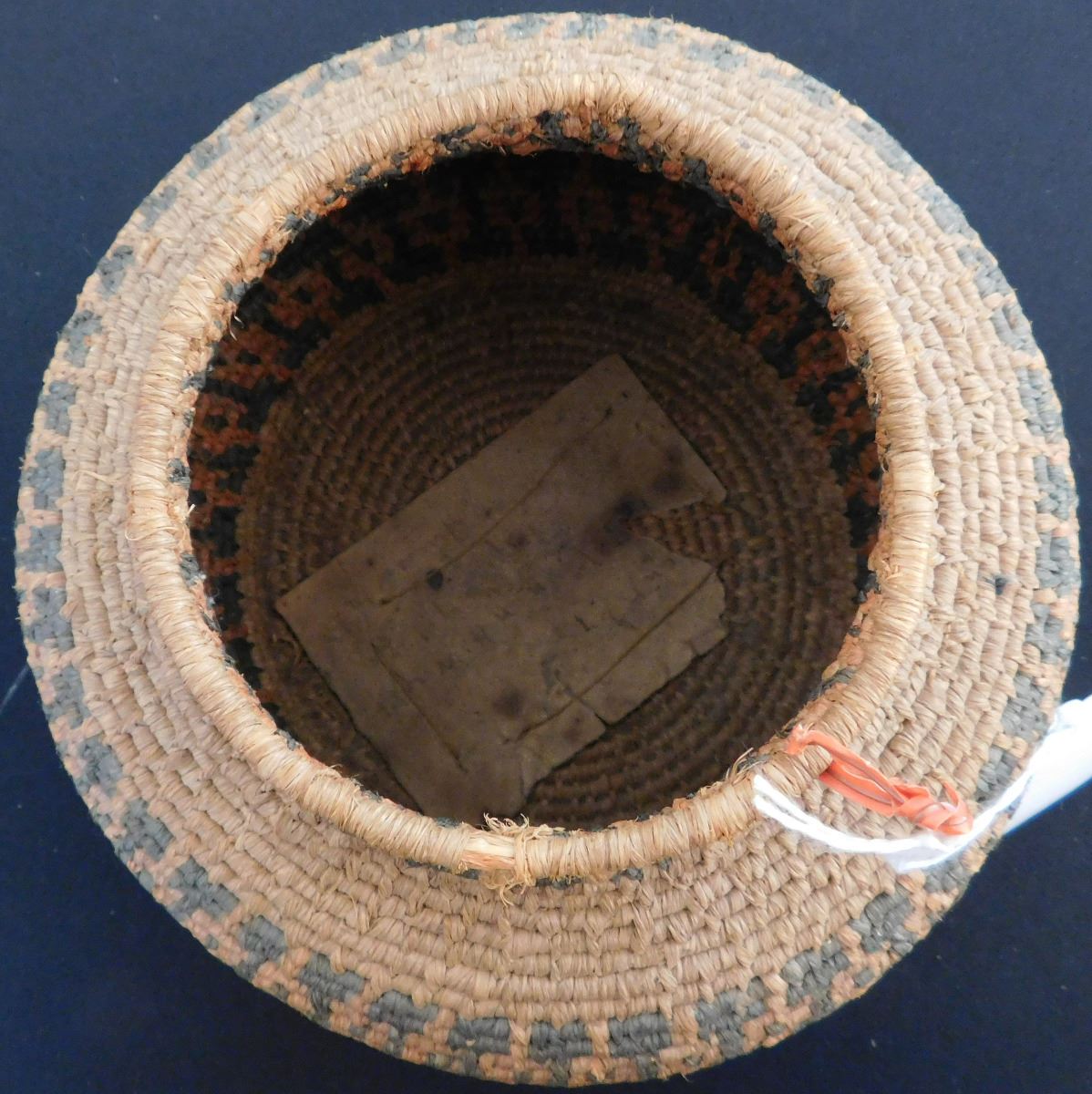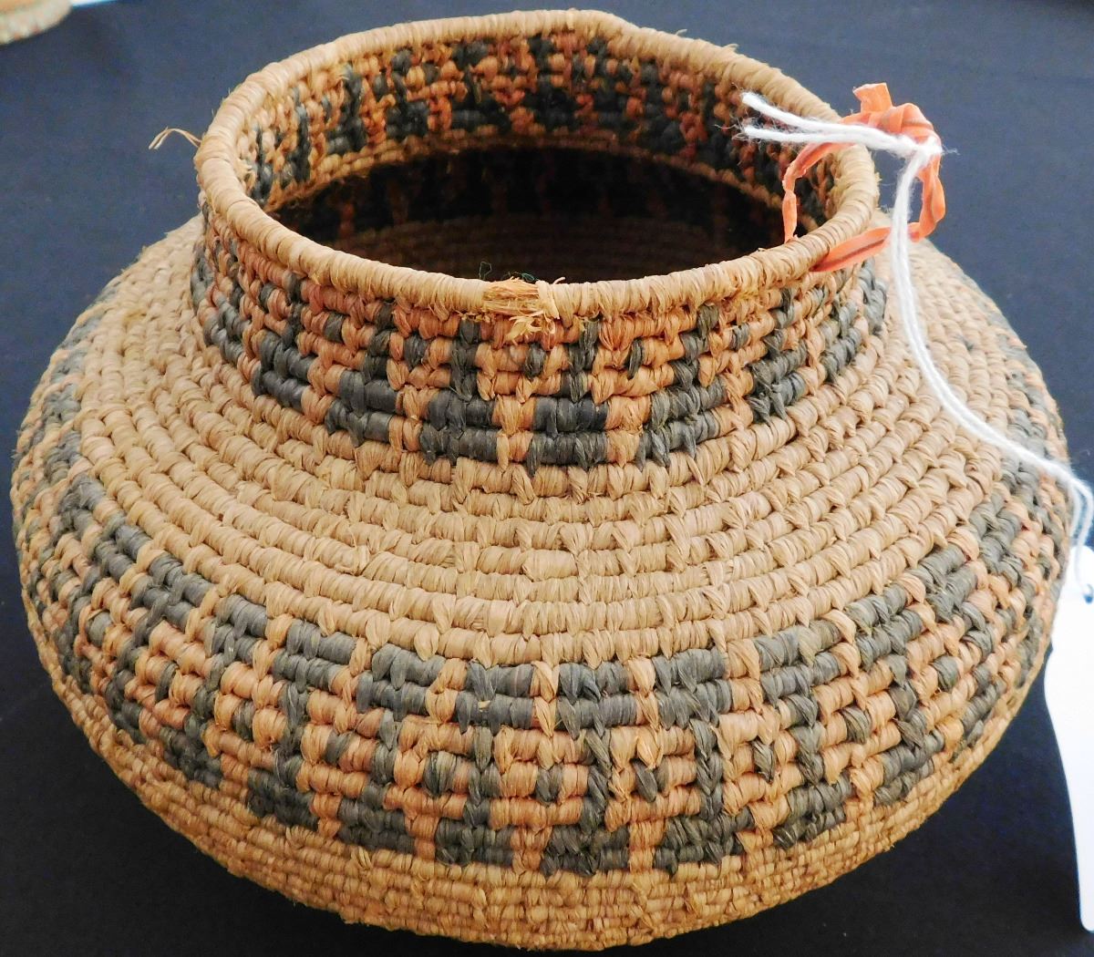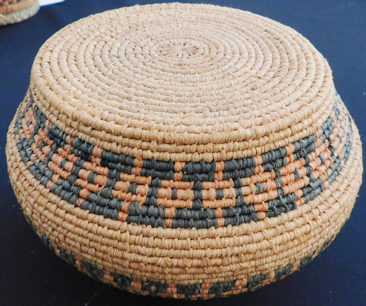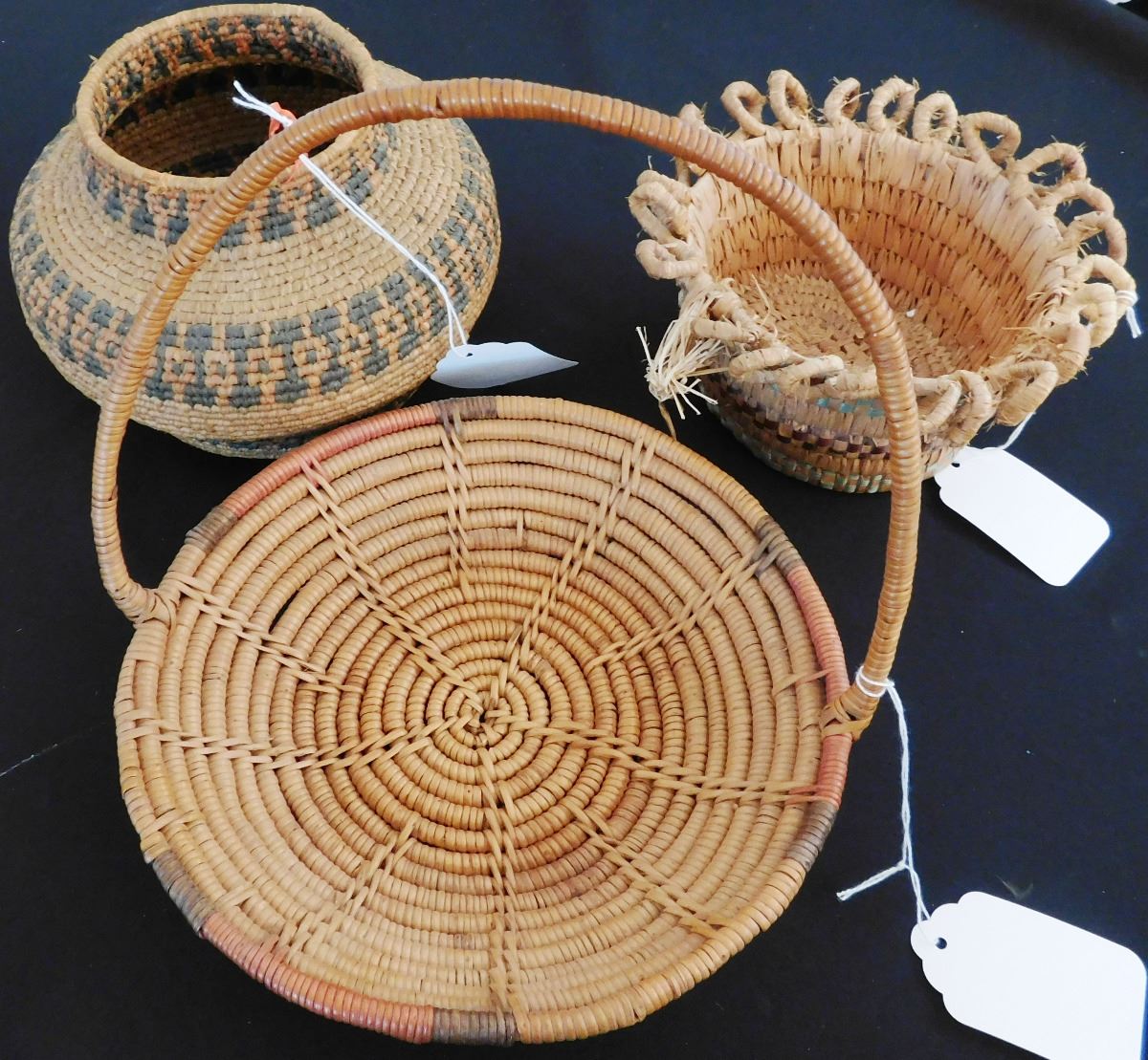 3 Native American Baskets, early 20th century, made of cedar, willow and raffia. Baskets measure 9" x 9", 8" x 6", and 7" x 4". May possibly be from Western Canada. Condition: Some wear and fading, minor stitch loss, see images. Shipping: $26.00.