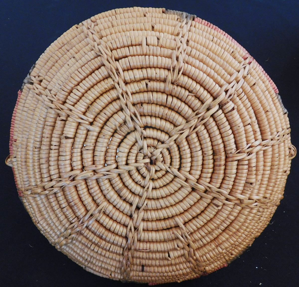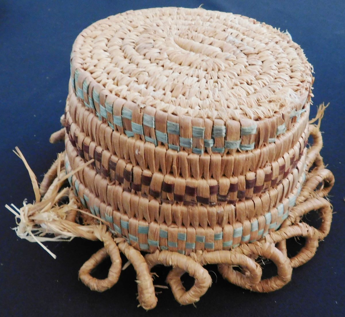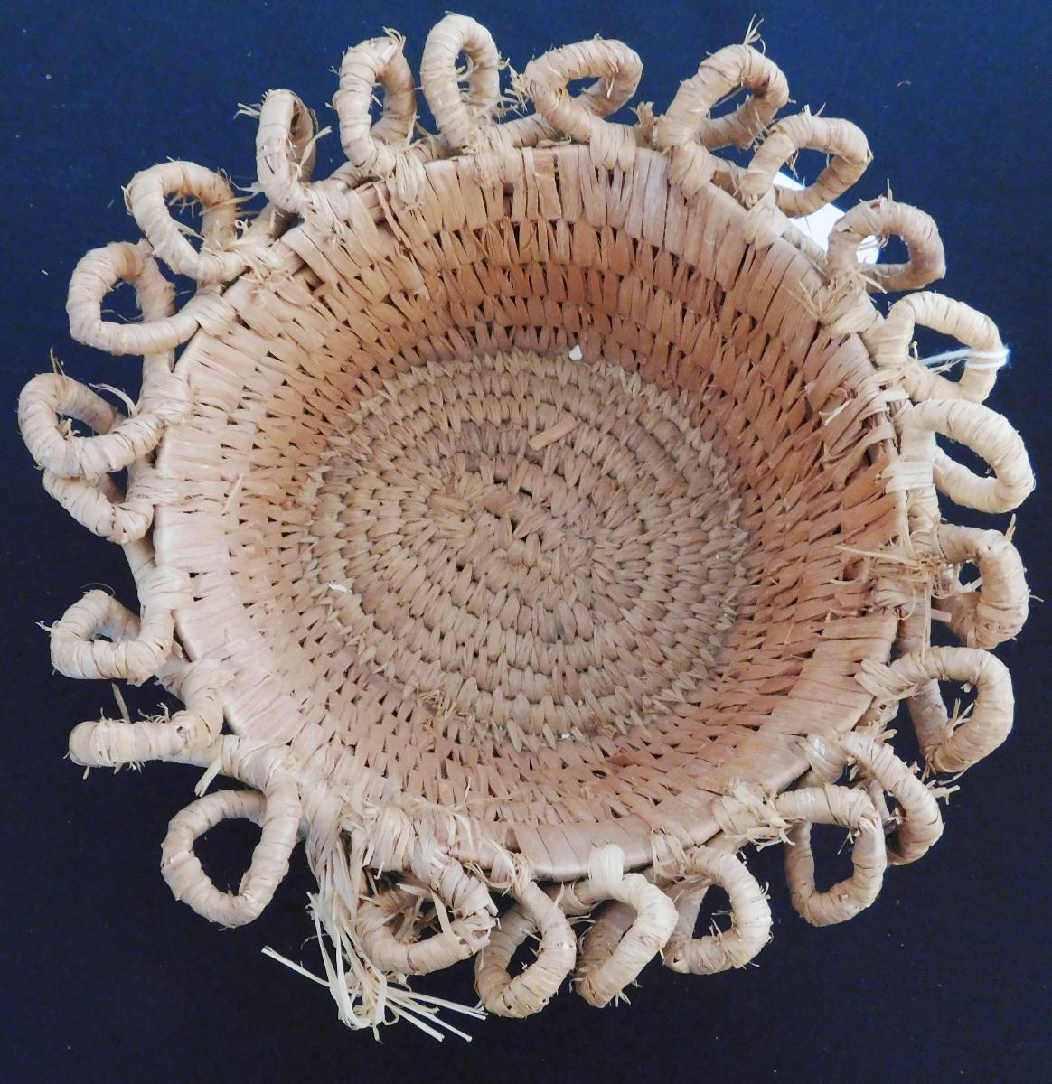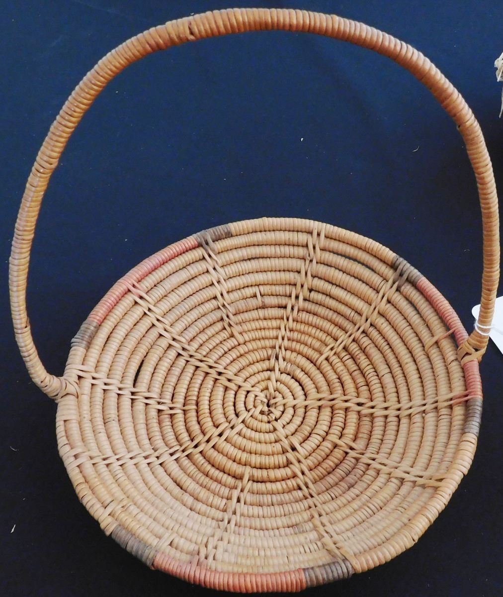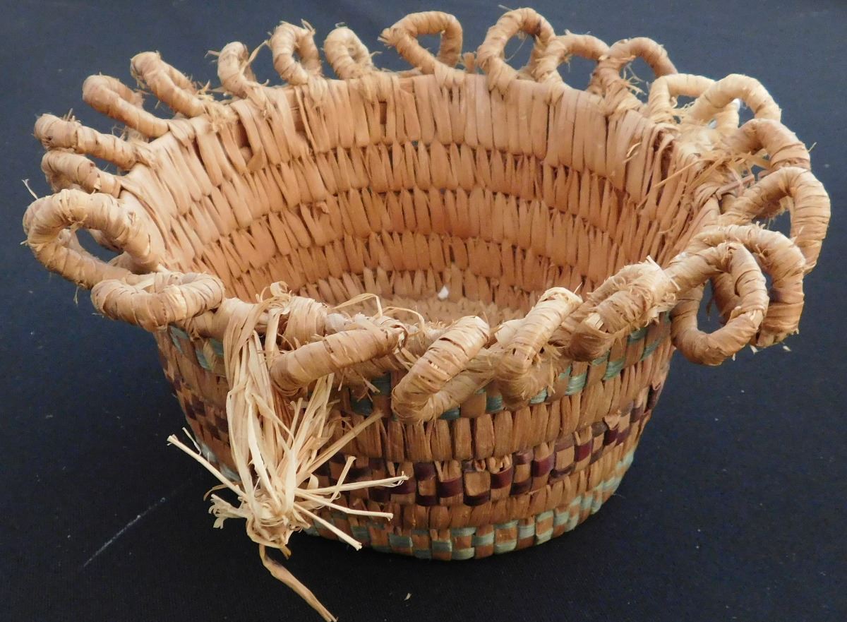 3 Native American Baskets, early 20th century, made of cedar, willow and raffia. Baskets measure 9" x 9", 8" x 6", and 7" x 4". May possibly be from Western Canada. Condition: Some wear and fading, minor stitch loss, see images. Shipping: $26.00.