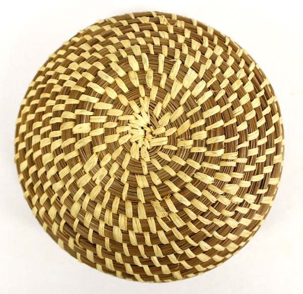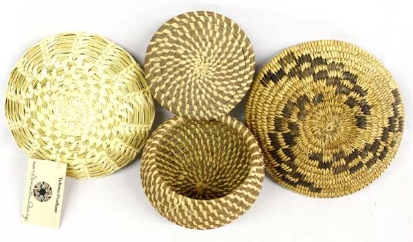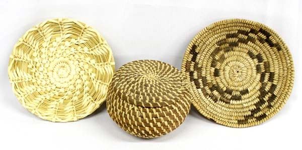 3 Native American Baskets, includes: 1. Native American Tohono O'odham Basket by Annette Doringo, measures 1'' x 5.5''D 2. Vintage Pima Stairstep Design Basket, measures .75'' x 6'' 3. Lidded Coushatta Basket, measures 3'' x 4.5''