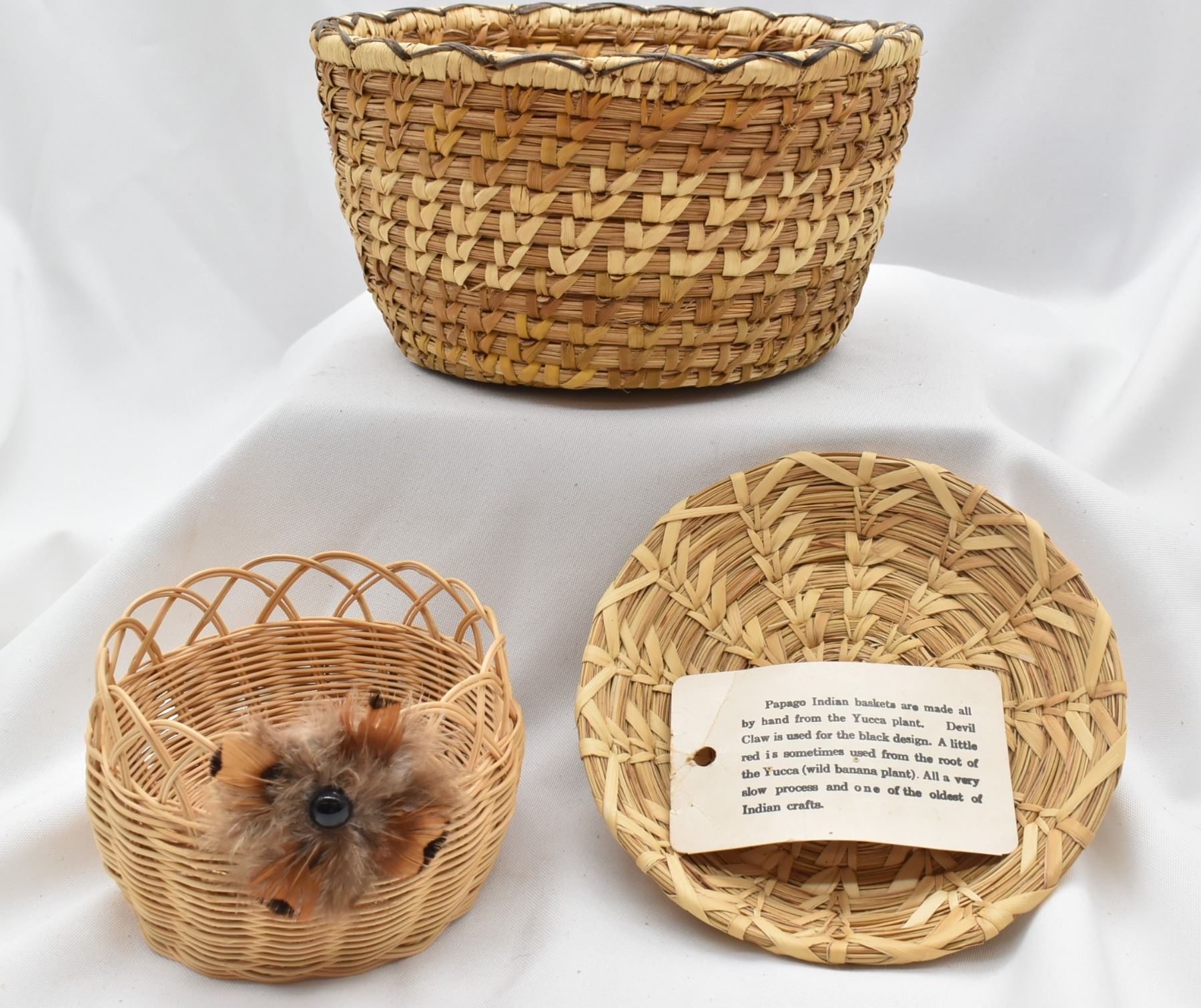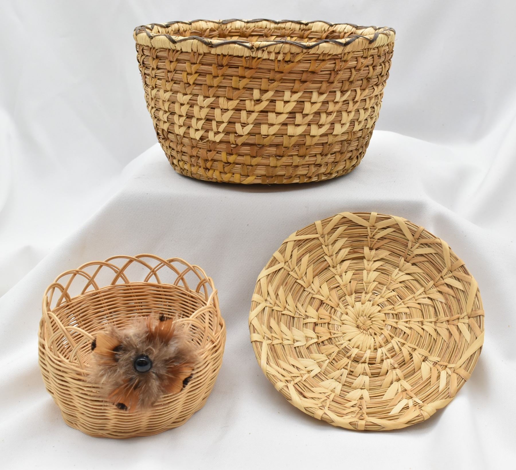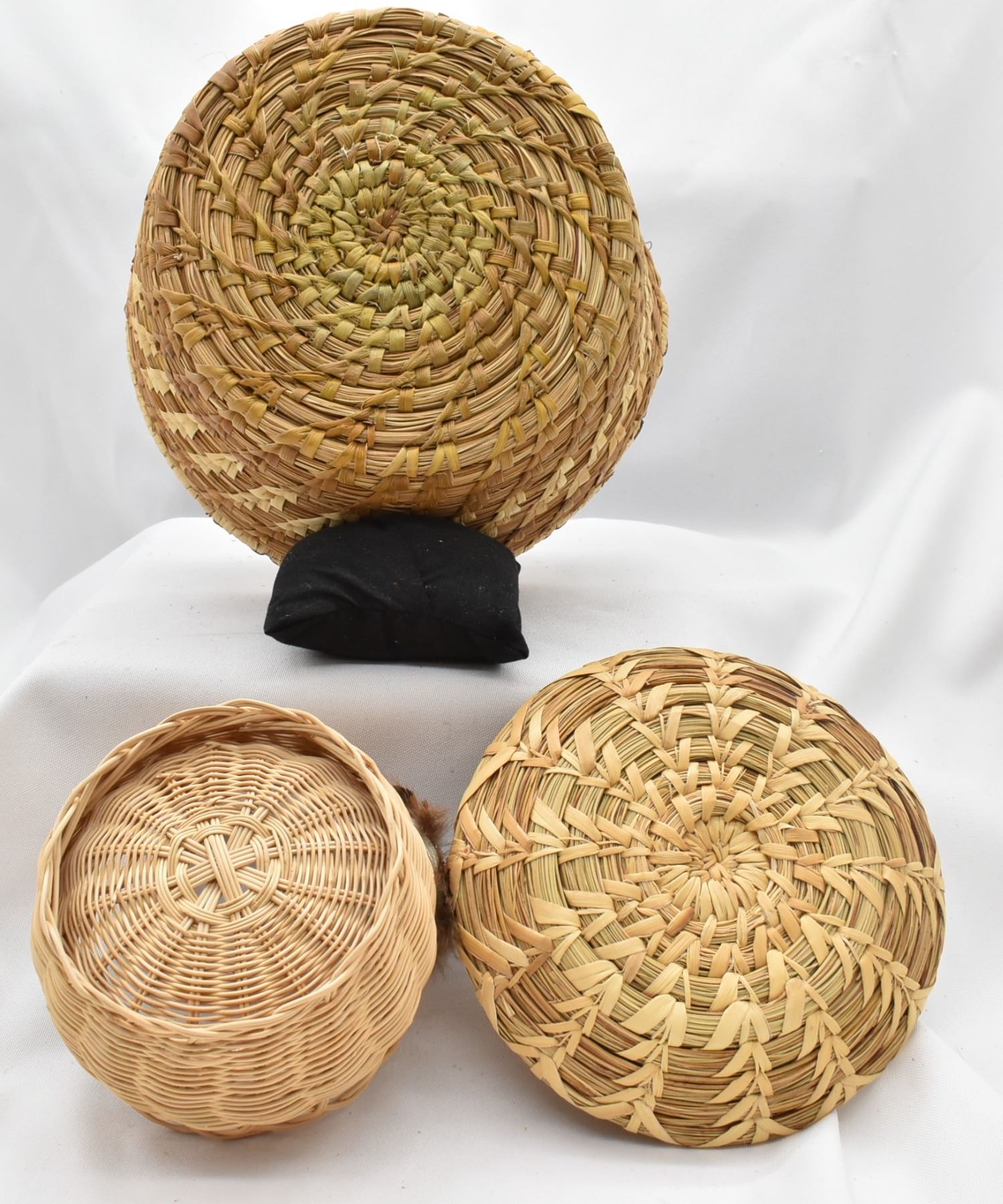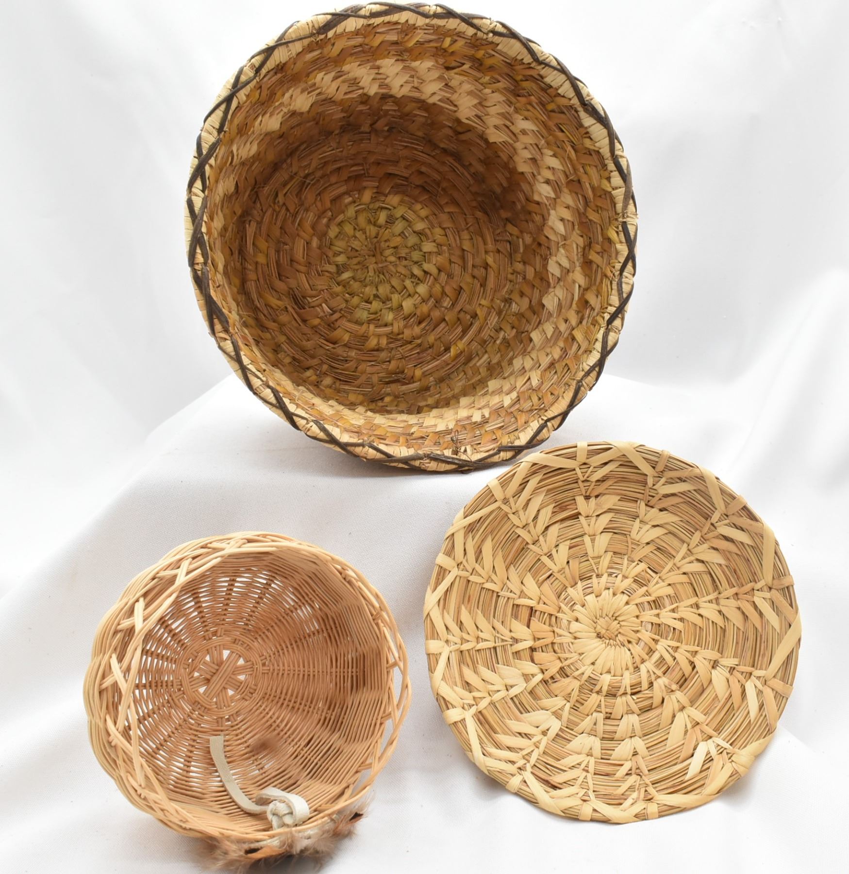 3 Native American Baskets, includes 2 Tohono O'odham (split stitch and wheat stitch) and 1 Cherokee Honeysuckle Vine Basket embellished with feathers, largest measures 4'' x 8''