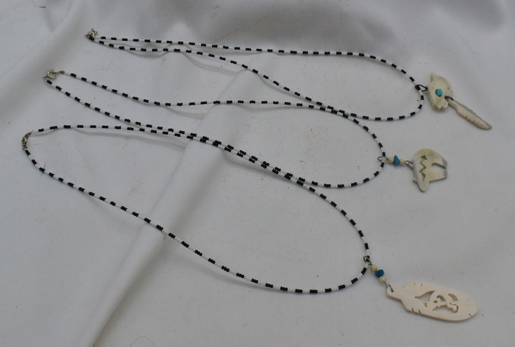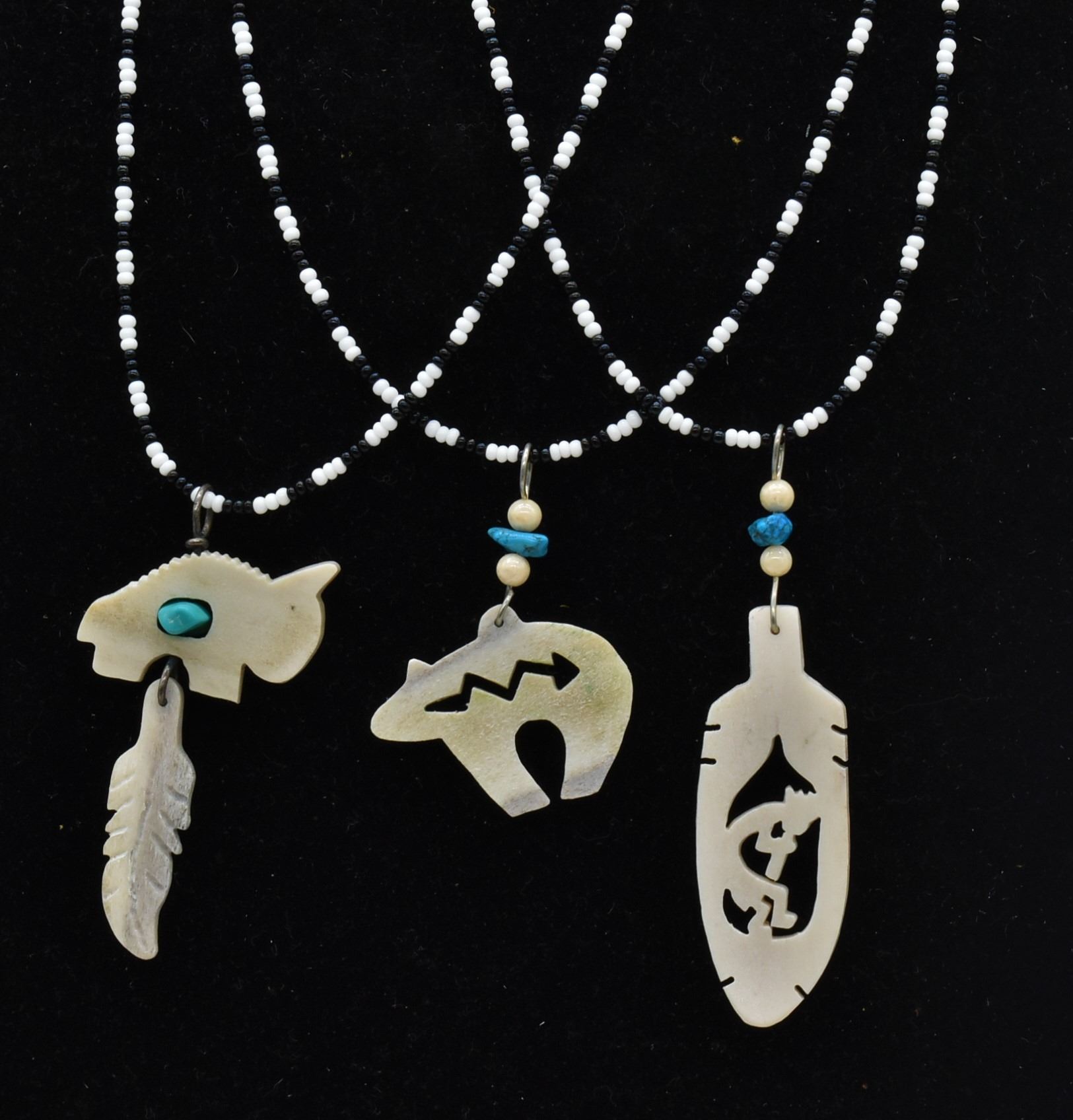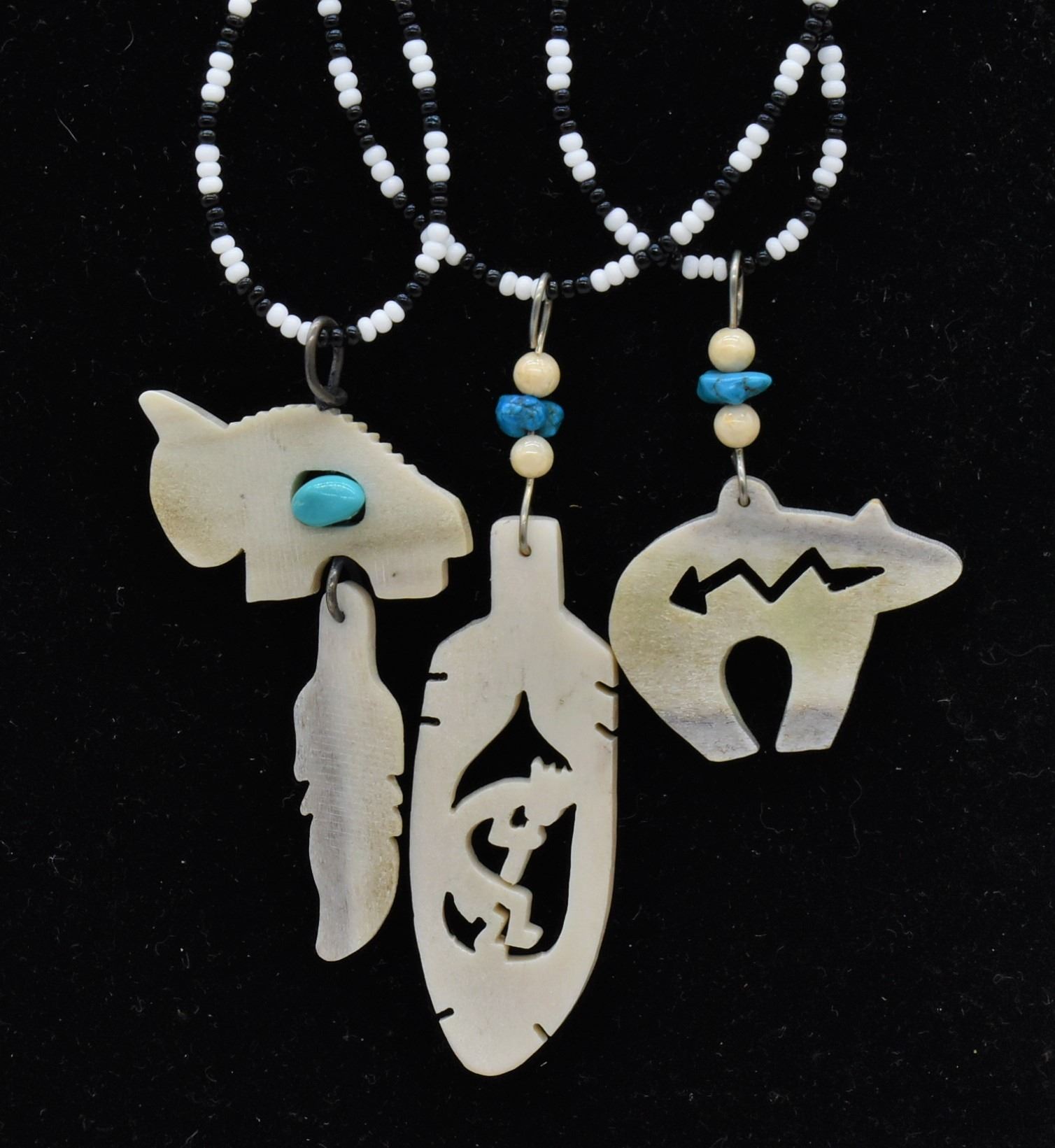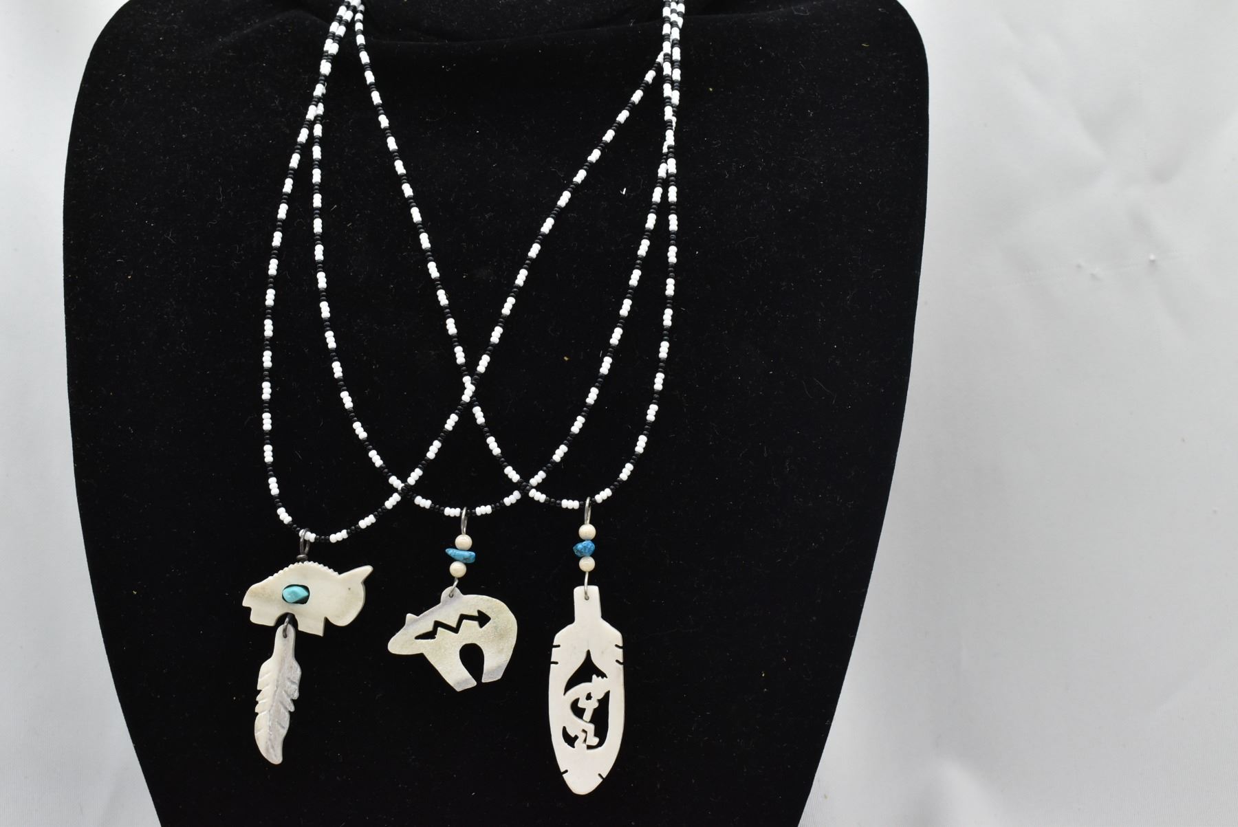 3 Native American Navajo Bead and Bone Pendant Necklaces by Nicholas Claw, includes buffalo, bear, and kokopelli feather, longest pendant measures 2.5''L x 1.25'', longest necklace measures 21''L end to end