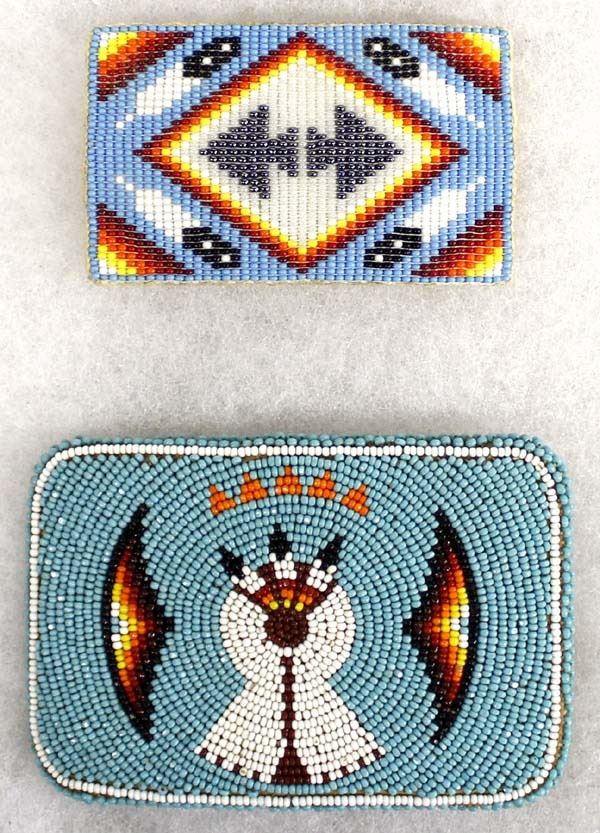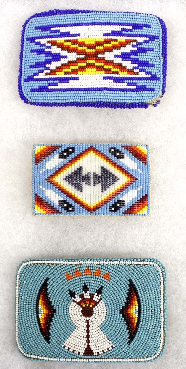 3 Native American Beaded Belt Buckles, largest buckle measures 4.25'' x 2.75'', the cobalt blue buckle has missing beads on one corner, all are beaded on doeskin