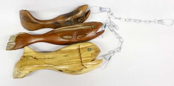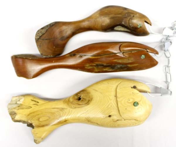 3 Native American Carved Wood Fish Decoys, all have chip inlay turquoise eyes, longest fish measures 13.5''L x 3''W, on a metal fish stringer