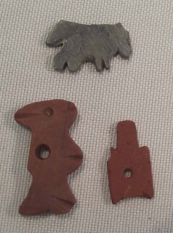 3 Native American Fetish. Two Flat Fetish, one reddish and one is grey. Two red ones have holes in the middle. Largest measures approx. 1'' x 1/2''. Acquired in accordance with all state and federal regulations.