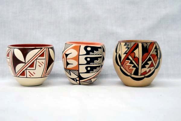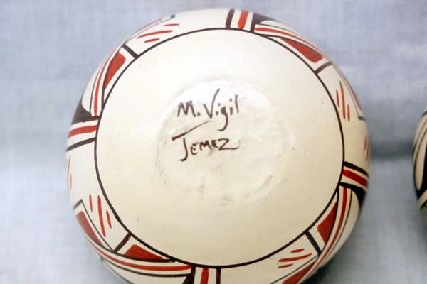 3 Native American Jemez Polychrome Pottery Jars, largest measures 3.5''D x 2.5''H, one is signed M. Toya and one is signed M. Vigil