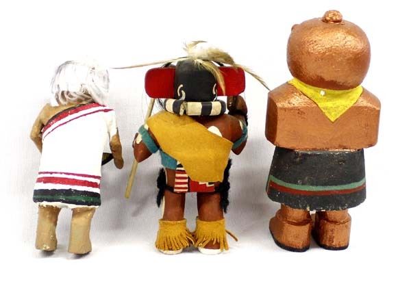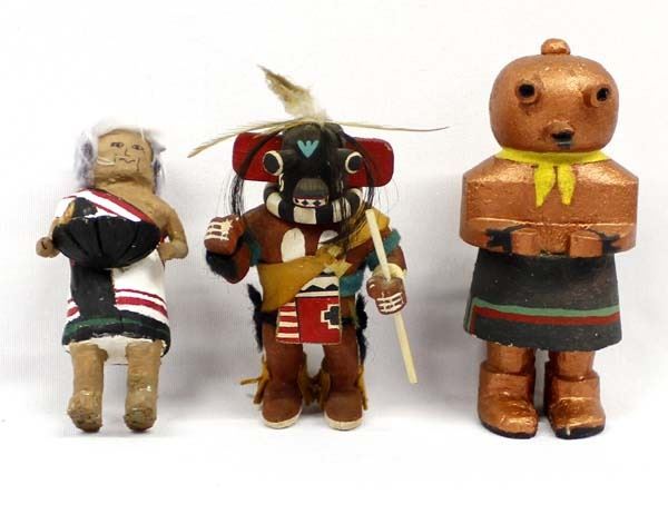 3 Native American Kachina Dolls, includes: Mudhead (largest measuring 2'' x 4''), Ogre embellished with feathers, leathers, and yarn, and a man carrying a bowl embellished with faux hair