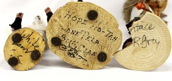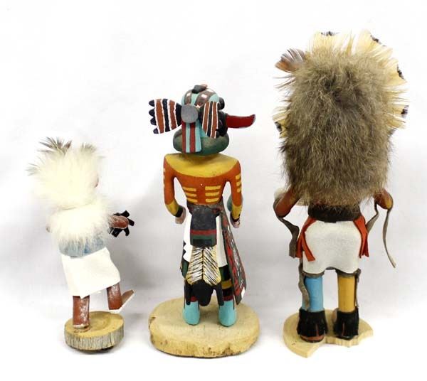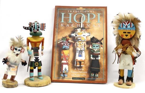Massey Estate: 3 Native American Kachinas and Book on Kachinas, includes 1. Navajo White Bear Kachina, initialed by artist S.S. and measures 5.5''H, embellished with feathers, leather, and rabbit fur 2. Hopi Ho-Tah Kachina by Lane Pela, Sun Clan and measures 7''H, he is missing his left ear piece and item in left hand, signed by the artist 3. Navajo Sunface Kachina by R. Grey, signed by the artist and measures 8.5''H, the wood base is broken off, embellished with rabbit fur, feathers, and leather 4. Traditional Hopi Kachinas: A New Generation of Carvers by Jonathan S. Day, softback book c. 2000 Northland Publishing