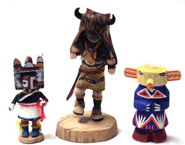3 Native American Kachinas, includes: #1 Hopi Jemez Buffalo Kachina by V.J. Poleawa, Fire-Coyote Clan of Sichomovi, AZ, signed by the artist, this is a finely detailed pieced, it is unfortunate that both forearms and hands are missing as well as part of the red piece on the headdress in the back, measures 4.5''H #2 Vintage Route 66 Navajo Kachina, measures 3''L x 1.75''W x 1.5''Deep #3 Hopi ''Zuni Hemis Corn'' Kachina, measures 3.25''H x 1.25''W x .75''Deep and is embellished with yarn and feathers