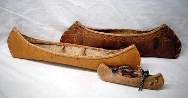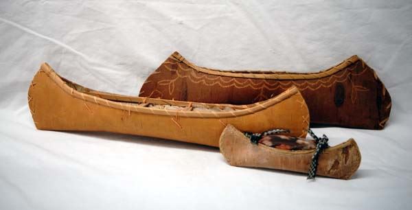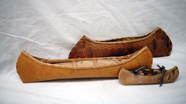 3 Native American Miniature Birchbark Canoes, longest measures 17.5''L x 4''W x 3.5''Deep, the medium sized canoe has damage to one end