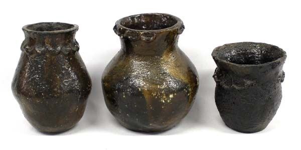 3 Native American Navajo Pottery Pitch Jars, largest measures 3'' x 4'', ''drum jars''