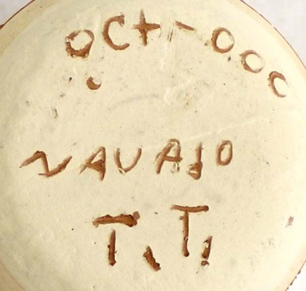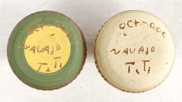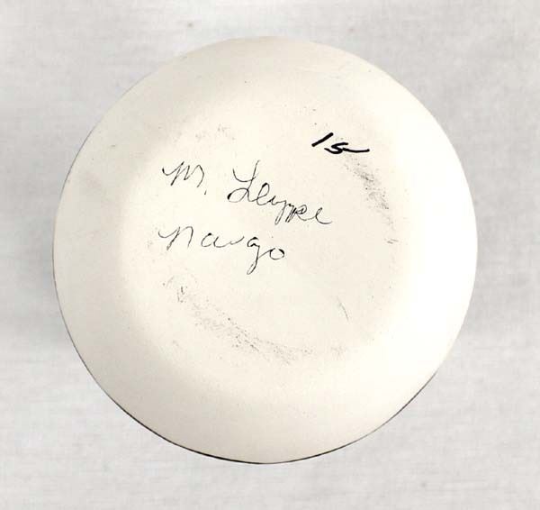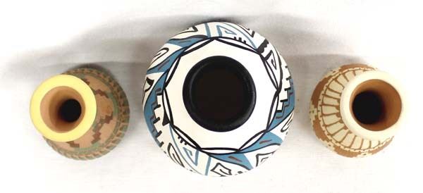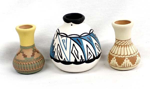 3 Native American Navajo Pottery Vases, includes 2 incised hand painted ceramic pottery vases and 1 hand painted vase by M. Leype which is the largest measuring 3.5'' x 3.5'', all are signed or initialed