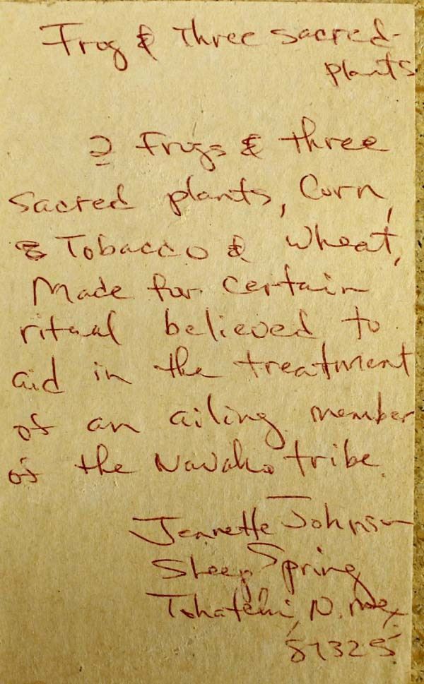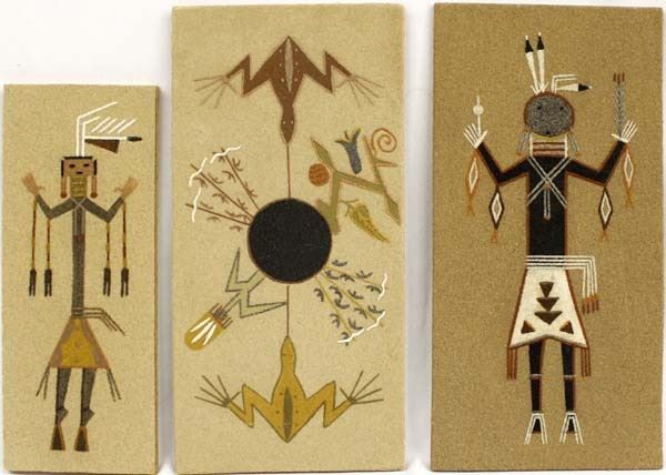3 Native American Navajo Sand Paintings, includes 1) ''The Healing People'' by Lucy Curtis 2) ''Frog & 3 Sacred Plants'' by Jennette Johnson of Sheep Spring in Tohatchi, NM 3) ''Yei-be-Chai'' by Patsy Miller, largest measures 6'' x 12''