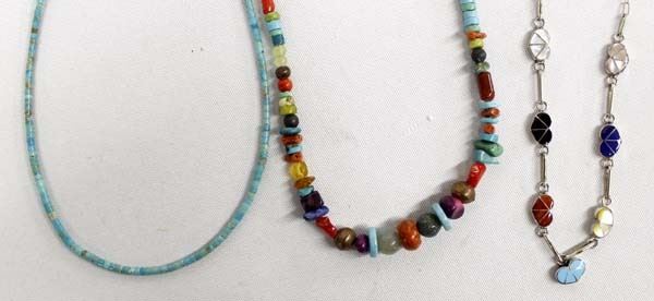 3 Native American Necklaces, includes 1. Navajo Turquoise Heishi Choker 2. Navajo Multi-Stone Necklace (turquoiuse, coral, agate, amethyst, gaspeite, amber, lapis, jasper, plus), longest measuring 20''L end to end 3. Zuni Sterling Inlay Heart Necklace, hand wrought chain, nice collection with a variety of stones