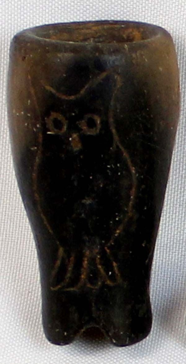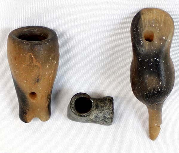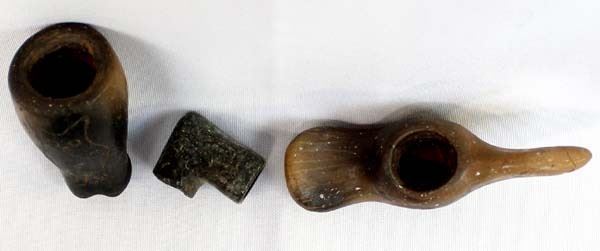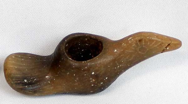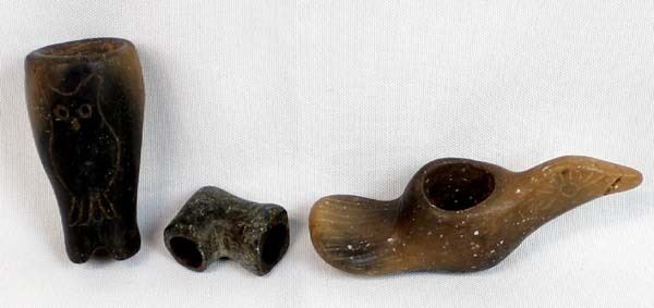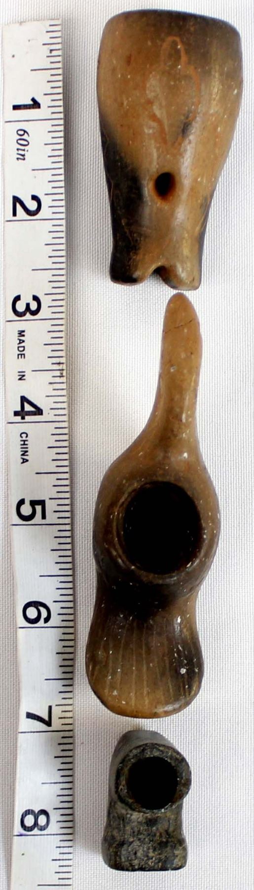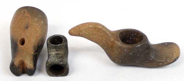 3 Native American Pottery Pipes, includes 1. Catawba Pottery Bird Pipe, largest measures 4''L, beak has been glued 2. Catawba Pottery Pipe, encised owl, snake, cloud, and fish designs 3. Pottery Elbow Pipe, possibly Mississipian