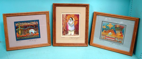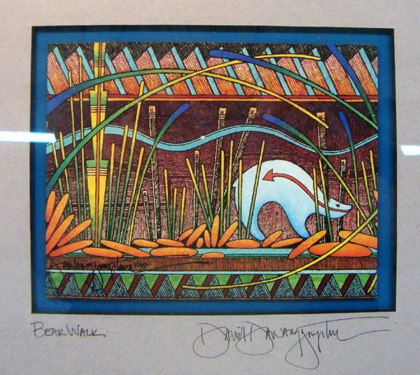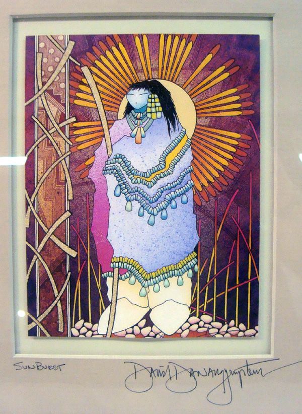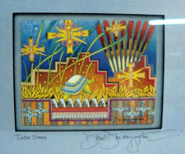 3 Native American Prints - David Dawangyumptewa. Framed in wood framed, under glass. They are titled: Sun Burst, Bear Walk and Turtle Stars. Visual measures approx. 7.5''H x 9.5''L. Very nice lot.